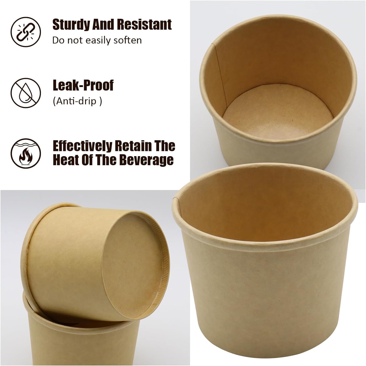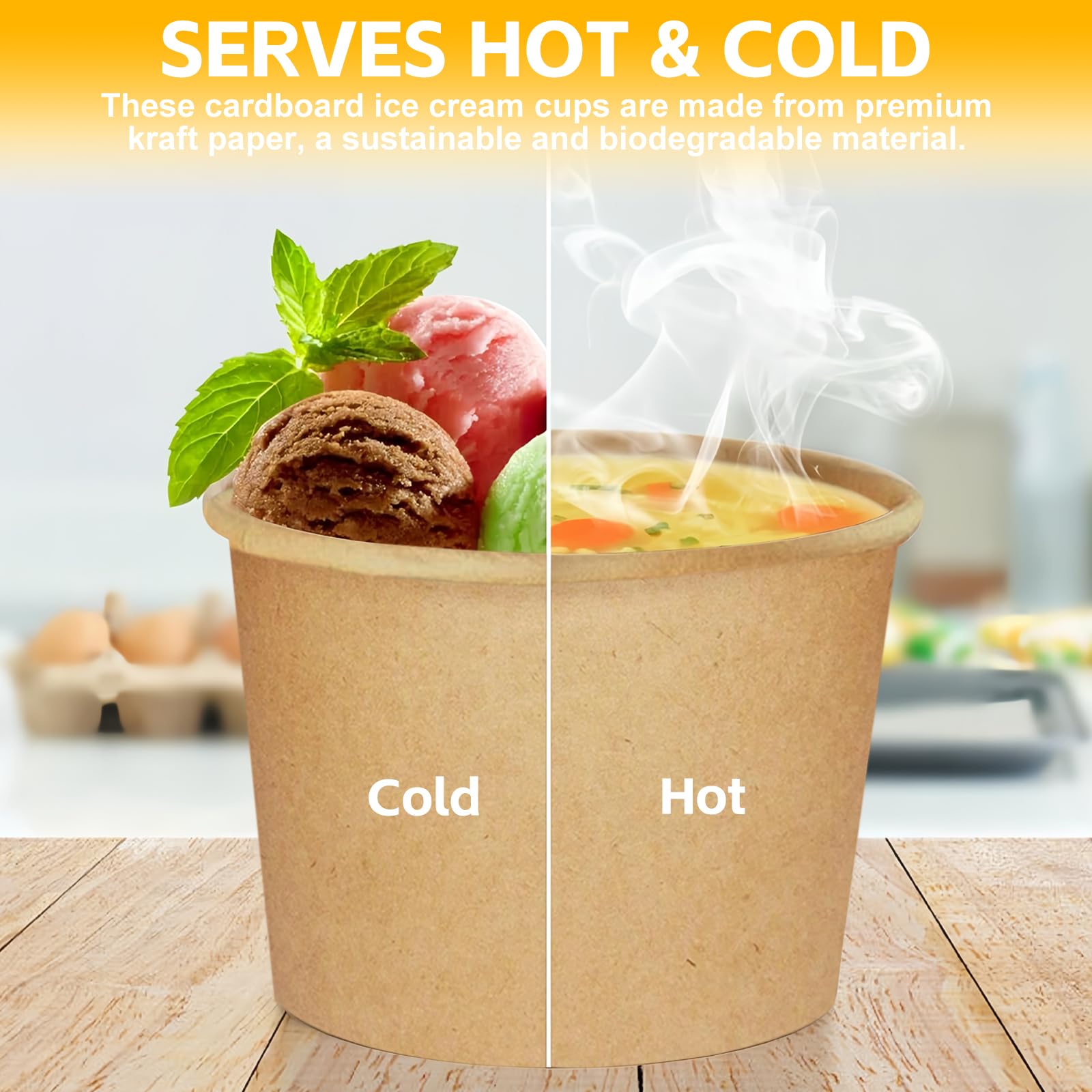 Suchst du umweltfreundliche Becher für deine nächste Party? Diese 50 Eisbecher aus Kraftpapier sind perfekt! Mit 240ml Fassungsvermögen ideal für Eis, Desserts oder Snacks. Komplett kompostierbar und plastikfrei - gut für die Umwelt! Die innere PE-Beschichtung macht sie auslaufsicher für kalte und heiße Speisen. Im Lieferumfang sind gleich 50 Löffel enthalten - alles was du brauchst. Maße: 90mm Öffnung, 73mm Boden, 60mm hoch. Perfekt für Eisdielen, Geburtstagsfeiern, Events oder den Hausgebrauch. Einfach verwenden und danach kompostieren - praktisch und nachhaltig!
