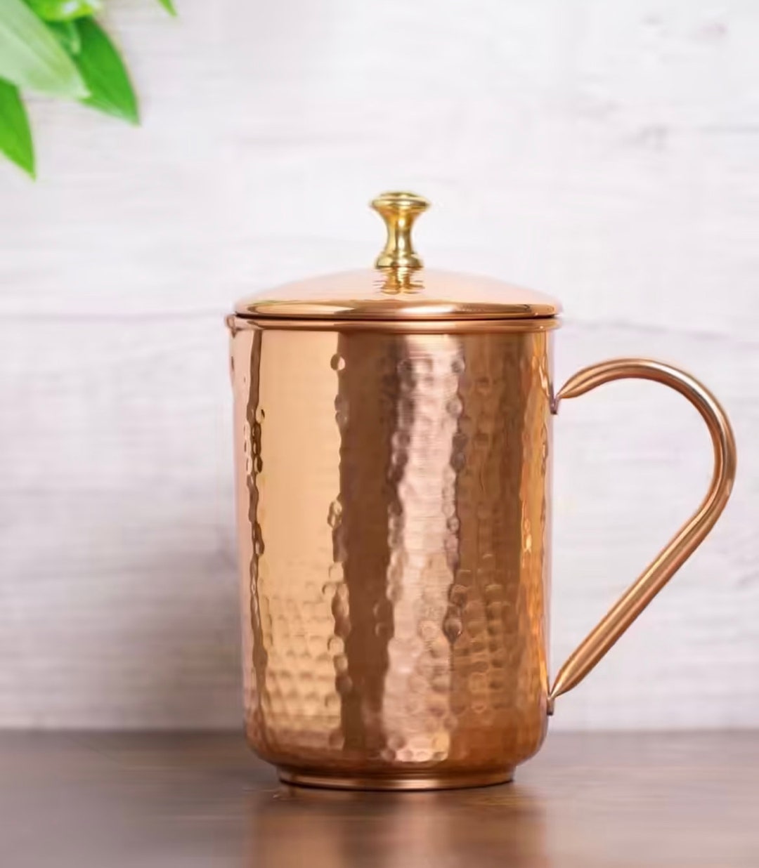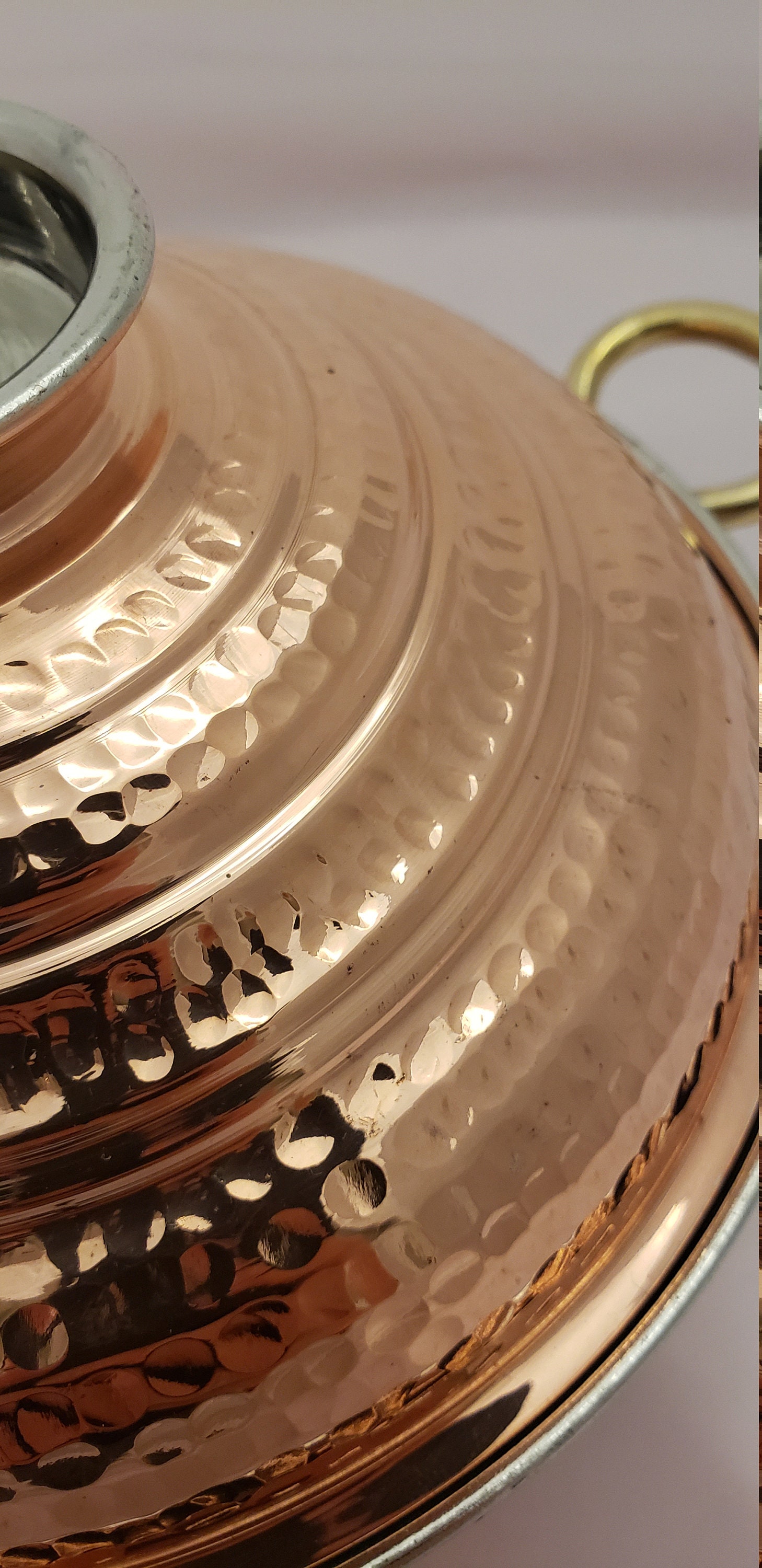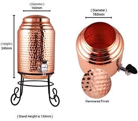 Trinkwasser aus Kupfer - gesund und traditionell! Dieser wunderschöne Wasserspender aus 98,5% reinem Kupfer fasst 5 Liter und kommt komplett mit Eisenständer und 2 Kupfergläsern. Der integrierte Wasserhahn verhindert lästiges Verschütten. In der Ayurveda-Medizin wird Wasser aus Kupfergefäßen seit jeher geschätzt. Wichtig: Von Hand reinigen mit Pitambari-Pulver, nicht in die Spülmaschine! Kupfer oxidiert natürlich mit der Zeit - das ist ganz normal und beeinträchtigt die Qualität nicht. Ein tolles Stück für Küche, Büro oder als Geschenk!