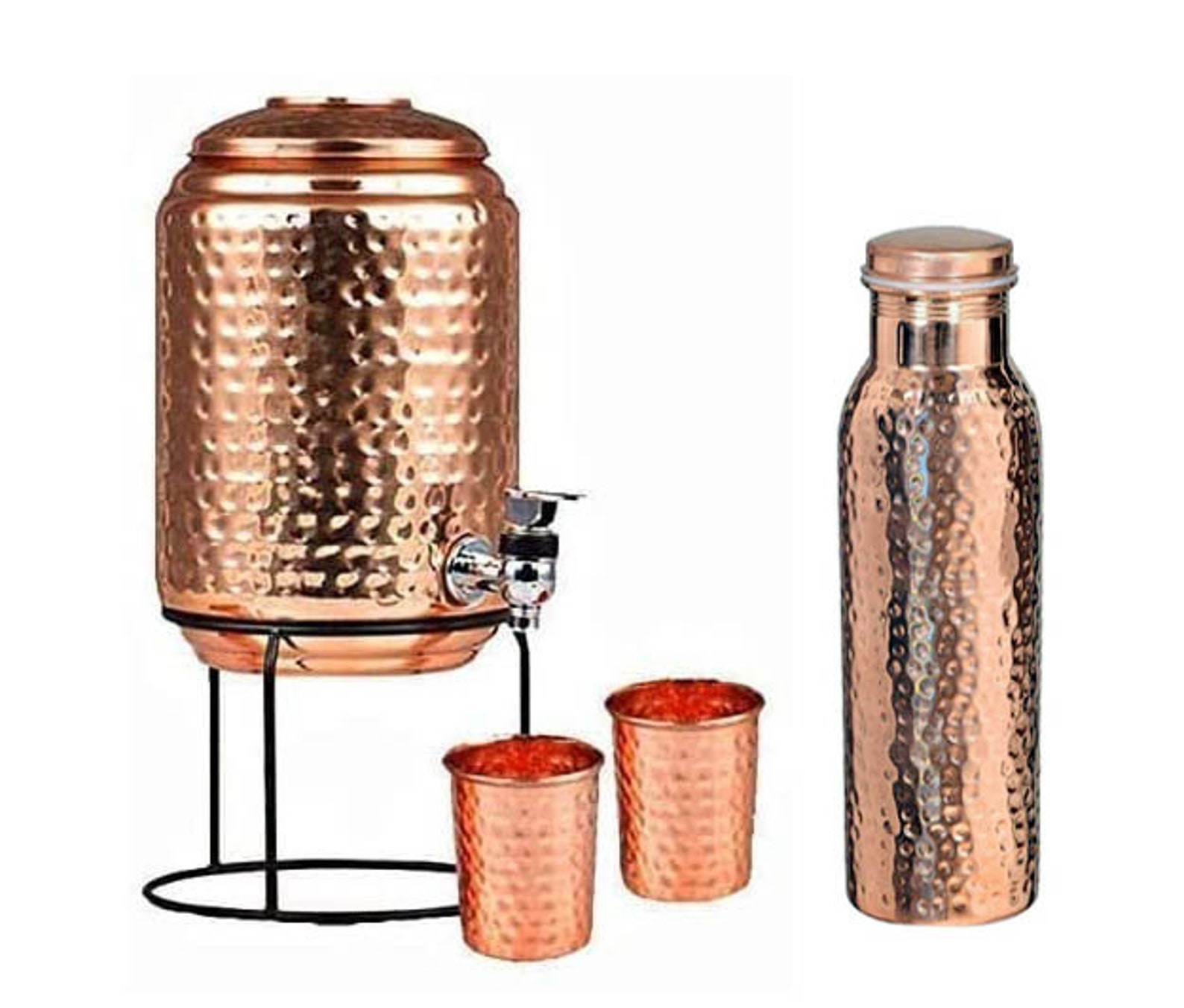• Reiner Kupfer Wasserspender 5000ml - Matka/Topf Mit 2 Gläsern Und Ständer