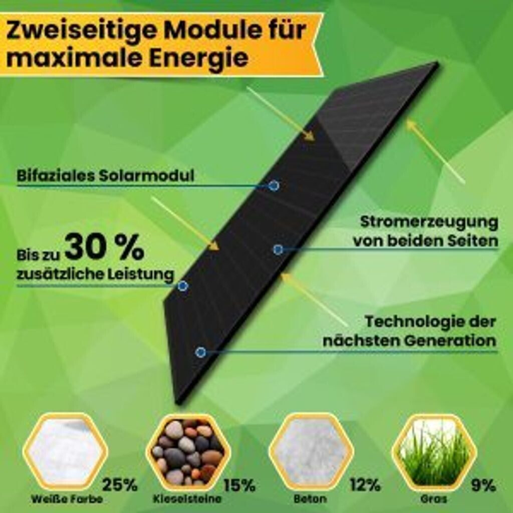 Hey, willst du deinen eigenen Strom produzieren? Mit diesen SUNNIVA 500W Solarpanels im Full Black Design geht's los! Das Set besteht aus zwei Modulen - zusammen satte 1000W Leistung. Die bifaziale Technologie bedeutet: Die Panels nutzen auch das reflektierte Licht von der Rückseite und produzieren so mehr Strom als herkömmliche Module. Mit den Maßen 1906x1134x30mm passen sie super auf Balkone, Garagendächer oder im Garten. Die Glas-Glas-Bauweise macht sie extrem robust gegen Wind, Wetter und sogar Hagel. Anschluss ist super einfach mit den Standard-Steckern - quasi Plug and Play! Wichtig: Seit 2023 gibt's 0% Umsatzsteuer auf Solaranlagen bis 30kW peak. Die Module haben eloxierte Aluminiumrahmen und IP68-Anschlussdosen - also absolut wetterfest. Perfekt für dein Balkonkraftwerk oder eine komplette PV-Anlage. Du sparst Stromkosten und tust was für die Umwelt - win-win! Die schwarze Optik sieht dazu noch richtig edel aus. Egal ob du Mieter oder Eigentümer bist - mit diesen Panels startest du deine persönliche Energiewende. Einfach montieren, anschließen und schon produzierst du deinen eigenen Ökostrom!