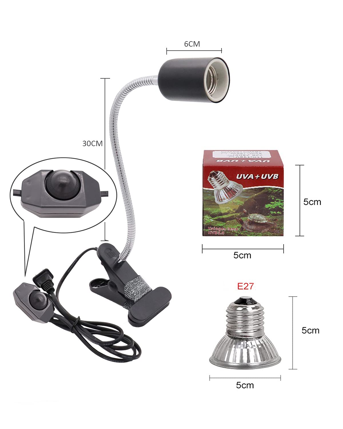 Für das Wohlbefinden deiner Reptilien - die YANHE Wärmelampe mit UVA- und UVB-Strahlung! Mit 50 Watt Leistung und E27-Fassung sorgt diese Lampe für den perfekten Hotspot in deinem Terrarium. Der Lampenkopf ist um 360 Grad drehbar, sodass du die Lichtposition genau nach den Bedürfnissen deiner Tiere ausrichten kannst. Die UVA-Strahlung fördert die natürliche Aktivität und das Wohlbefinden, während UVB-Strahlung für die wichtige Vitamin-D3-Synthese notwendig ist. Das rutschfeste und langlebige Design fixiert die Glühbirne sicher und verhindert ein Lösen. Perfekt geeignet für alle Arten von Reptilien wie Schildkröten, Landschildkröten, Eidechsen, Schlangen, Frösche und andere exotische Haustiere. Ob zum Aufwärmen, für die Verdauung oder zur Unterstützung des Wachstums - diese Lampe schafft die idealen Bedingungen für deine tierischen Mitbewohner. Einfach in die E27-Fassung schrauben, positionieren und deine Reptilien werden es dir danken. Schaffe eine artgerechte Umgebung und unterstütze die Gesundheit deiner Tiere mit dieser hochwertigen Wärmelampe!