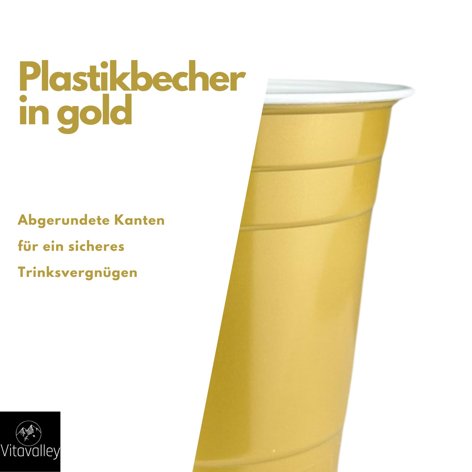 Hey Party-People! Diese 50 goldenen Plastikbecher sind der absolute Hingucker auf jeder Feier! Mit 473ml Fassungsvermögen (das sind die originalen US 16oz) passen da alle Getränke rein - ob Cocktails, Bier oder Softdrinks. Super stabil mit 10g Gewicht pro Becher und komplett BPA-frei. Du kannst sie sogar in der Spülmaschine bei 60°C waschen und mehrmals verwenden. Perfekt für Geburtstage, Grillfeste, Junggesellenabschiede oder einfach gemütliche Abende mit Freunden. Die abgerundeten Ränder sind super bequem zum Trinken und das klassische Design kommt immer gut an. Mach deine nächste Party unvergesslich - bestell die goldenen Becher und sorg für strahlende Gesichter!