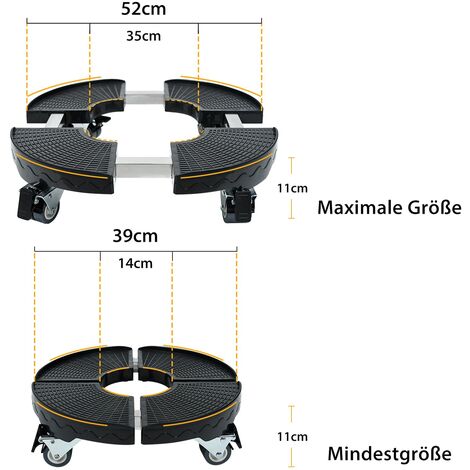 Schwere Pflanzen bewegen war noch nie so einfach! Dieser verstellbare Pflanzenroller nimmt dir die schwerste Arbeit ab. Mit satten 300kg Tragkraft und verriegelbaren Rädern. \\n\\nDer Durchmesser lässt sich von 39-52cm anpassen - perfekt für verschiedene Topfgrößen. Die 360° Schwenkräder mit Bremsen sorgen für müheloses Bewegen und sicheres Stehenbleiben. \\n\\n• Verstellbar: 39-52cm Durchmesser - für alle Töpfe\\n• Tragkraft: 300kg - auch für schwere Pflanzen\\n• 4 Schwenkräder - mit 360° Drehung\\n• Verriegelbare Bremsen - sicheres Parken\\n• Material: PP + Edelstahl - witterungsbeständig\\n• Höhe: 11cm - optimale Arbeitshöhe\\n\\nOb auf dem Balkon, Terrasse oder im Wintergarten - deine Pflanzen sind jetzt mobil und umstellen wird zum Kinderspiel!