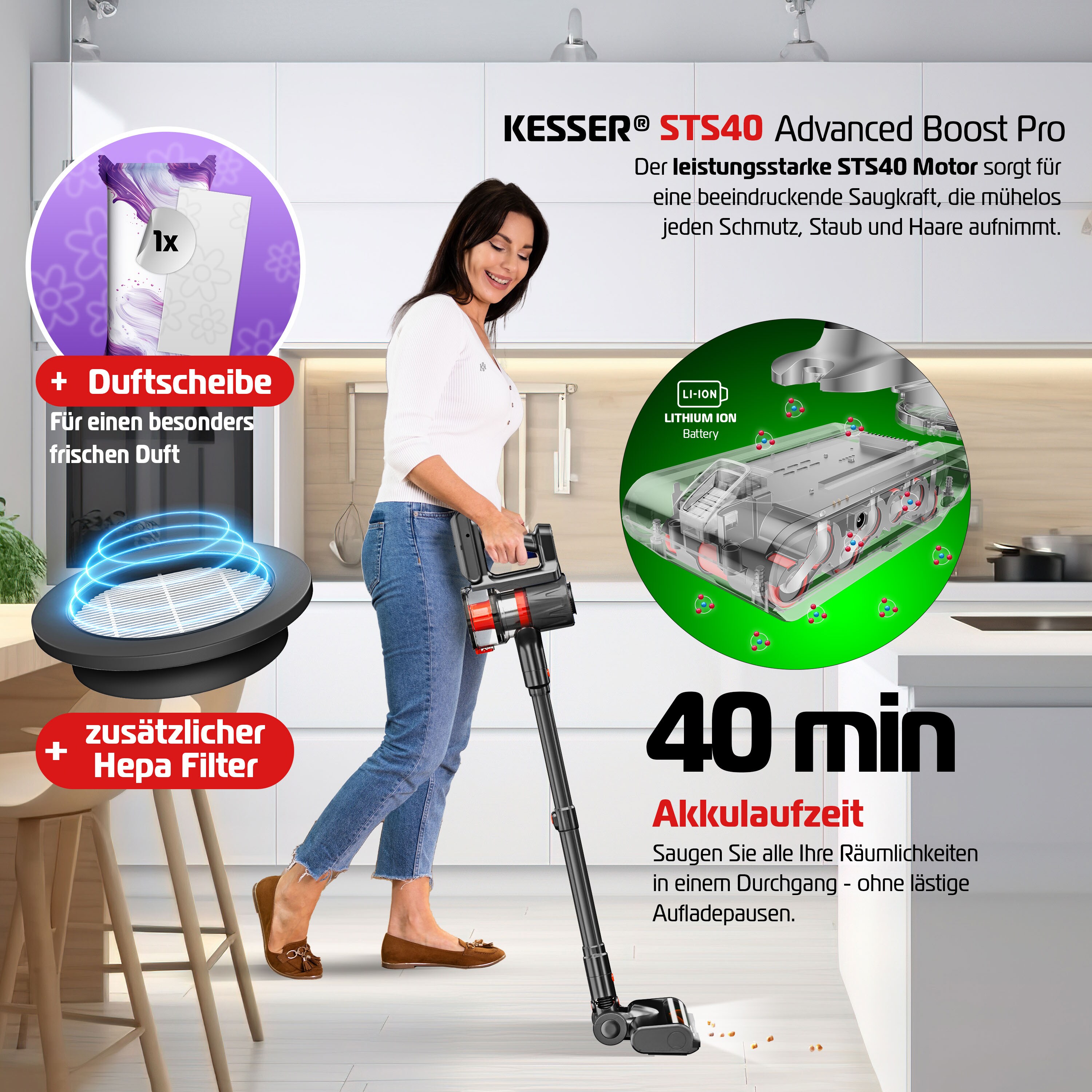 Saugen ohne Stress: Bis zu 55 Minuten durchgehend! Damit kriegst du auch größere Wohnungen easy in einem Rutsch sauber. Kein lästiges Aufladen zwischendurch. Und weil's ein beutelloser Staubsauger ist, entleerst du den Behälter einfach fix – kein Nachkaufen von Beuteln, gut für die Umwelt und deinen Geldbeutel.