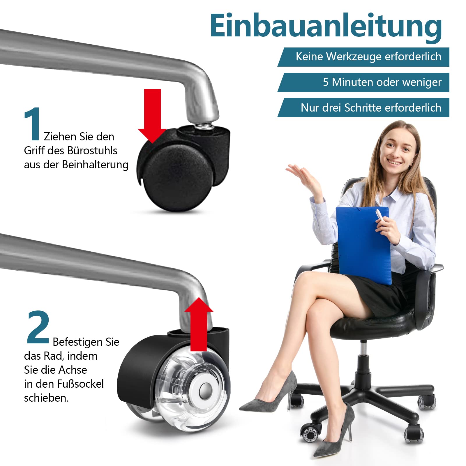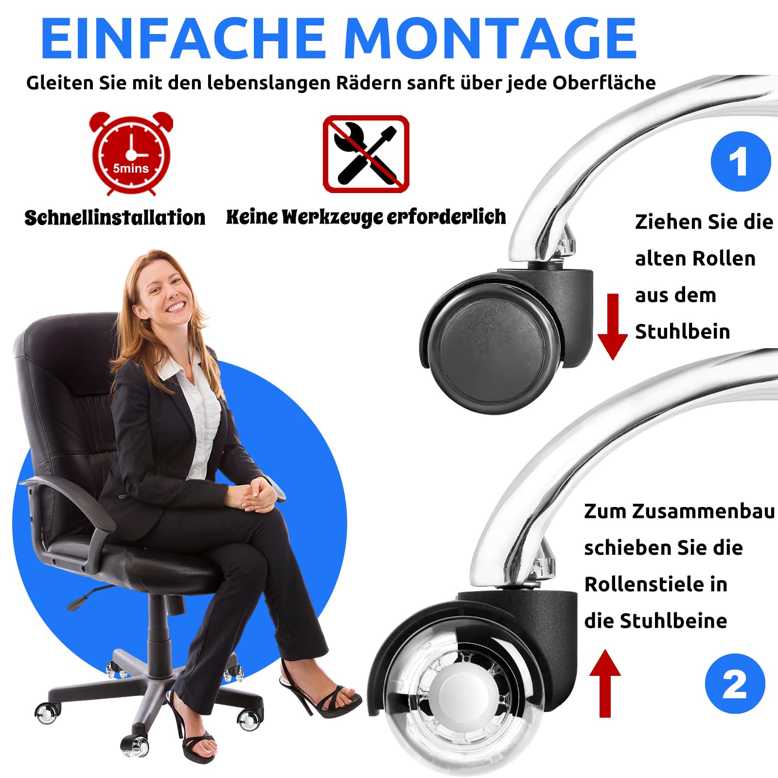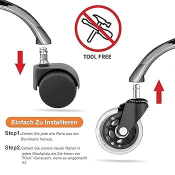Schluss mit Kratzern auf deinem Parkett oder Laminat! Diese 5 Gummirollen sind die Rettung für jeden teuren Boden. Super leise gleitest du damit durchs Büro - deine Kollegen werden's dir danken! Jede Rolle hält bis zu 150kg aus, das ist richtig stabil. Aus hochwertigem Polyurethan und mit Präzisionskugellagern - die Dinger laufen wie geschmiert. Passt auf die meisten Bürostühle mit 11x22mm Stiften (vorher kurz messen!). Einfach die alten Rollen rausziehen, neue reinstecken - kein Werkzeug nötig. Perfekt fürs Homeoffice, Gaming-Stuhl oder Großraumbüro. Dein Boden bleibt makellos und du rollst praktisch lautlos durch die Gegend. Einfach genial, wie viel Unterschied so kleine Rollen machen können!