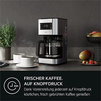 Perfekter Kaffee-Genuss mit dieser AEG Kaffeemaschine! Mit 1,5l Fassungsvermögen für bis zu 12 Tassen - ideal für Familie und Gäste. Die Aroma-Funktion verlängert den Brühvorgang für optimalen Geschmack. Die Glaskanne ist spülmaschinenfest und hat eine klare Wasserstandsanzeige. 40 Minuten Warmhaltefunktion und automatische Sicherheitsabschaltung für mehr Komfort. Mit Anti-Tropf-Ventil und entnehmbarem Filterkorb für einfache Reinigung. Das edle Edelstahl-Design passt in jede Küche! Einfach Wasser einfüllen, Kaffee in den Filter und auf Start drücken - schon duftet's herrlich! Dein perfekter Start in den Tag mit frischem Filterkaffee - einfach lecker!