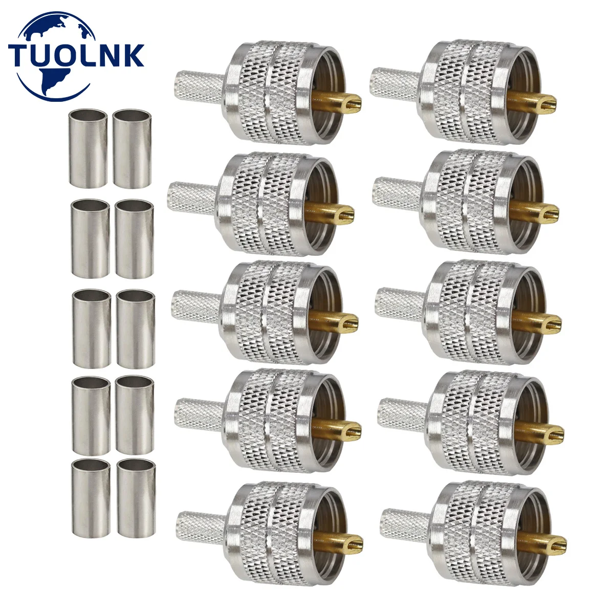 5 komplette Stecker-Sets für Koaxialkabel! PL-259 Stecker und SO-239 Buchsen aus vernickeltem Messing. Vergoldete Kontakte für beste Leitfähigkeit. Impedanz 50 Ohm, für Frequenzen bis 1000 MHz. Perfekt für RG58, LMR195, RG400 Kabel. Geringe Verluste (<0,1dB), SWR unter 1,2. Einfache Crimp-Montage - kein Löten nötig. Ideal für Amateurfunk, CB-Funk, Antennenbau. Mit Schrumpfschläuchen für professionelle Absicherung. Mach deine eigenen Kabel oder repariere alte Verbindungen!