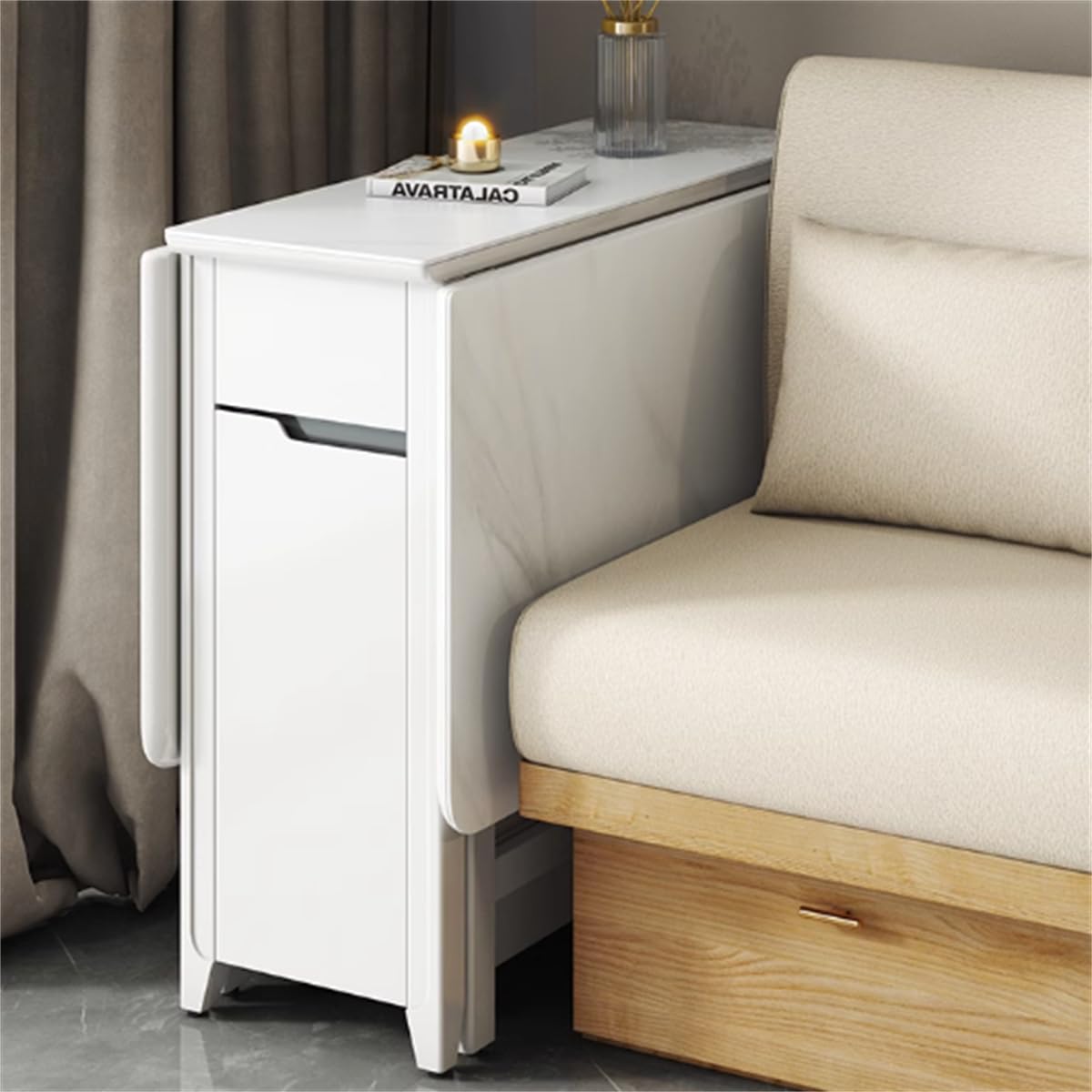 Perfekt für kleine Wohnungen! Dieser praktische Klapptisch verwandelt sich von kompaktem Sideboard zum großen Esstisch für bis zu 6 Personen. Mit 4 feststellbaren Rollen für einfaches Verschieben. Ausgeklappt: 100x70cm, zusammengeklappt nur 30cm tief. Enthält 3 offene Fächer und 2 Regale für Geschirr und Deko. Aus stabiler Spanplatte mit pflegeleichter Melaminoberfläche. Bis 20kg belastbar. Ideal für WG, Studentenbude oder als zusätzlicher Tisch für Gäste. Ein Möbelstück das mitwächst - vom kleinen Frühstückstisch zur großen Dinnerparty. Platzsparend und super funktional. Hol dir Flexibilität in deine vier Wände!