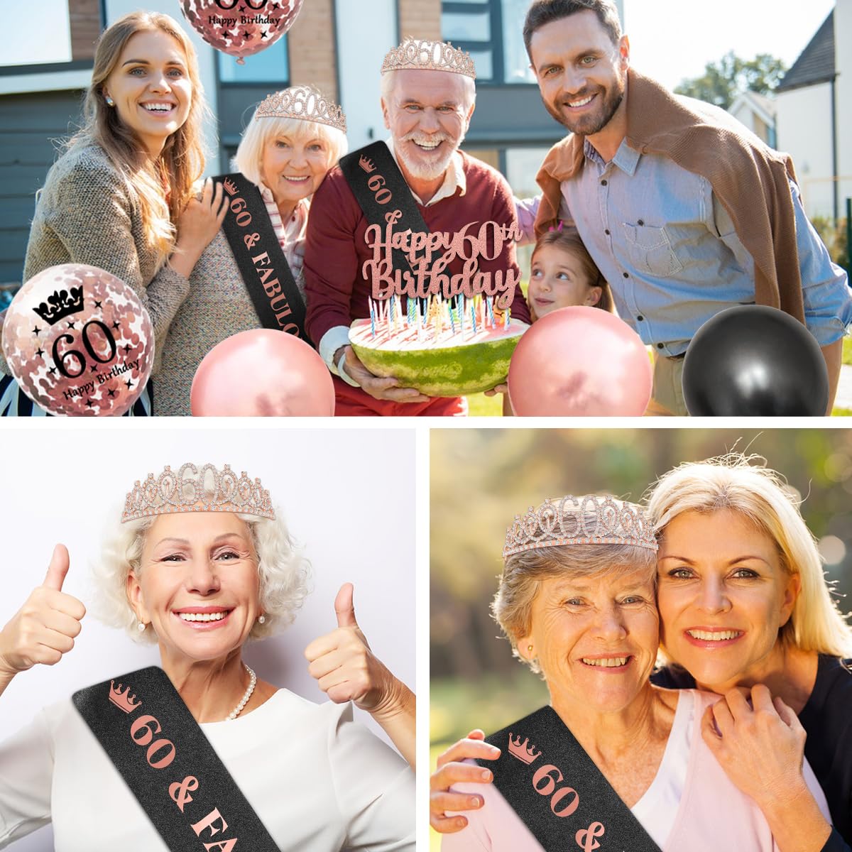 Mach den 60. Geburtstag zu einem unvergesslichen Event! Dieses komplett Set in Gold enthält alles, was du brauchst: eine funkelnde Krone mit Strasssteinen, eine elegante Schärpe mit der Aufschrift '60 & Fabulous' und einen goldenen Kuchenaufsatz. Die Krone ist verstellbar und passt auf jeden Kopfumfang. Die Schärpe aus glänzendem Stoff mit Perlenverzierung sieht einfach royal aus. Perfekt, um die Jubilarin in den Mittelpunkt zu stellen! Ob für die Geburtstagsparty, Jubiläum oder andere festliche Anlässe - dieses Set macht jede Feier besonders. Auch als Fotorequisit für unvergessliche Erinnerungsfotos super geeignet. Einfach anziehen und schon fühlt sich die Geburtstagsfrau wie eine Königin! Das hochwertige Material garantiert, dass die Deko die ganze Party über makellos aussieht. Ein ideales Geschenk, das garantiert Begeisterung auslöst! So wird der runde Geburtstag zum absoluten Highlight.