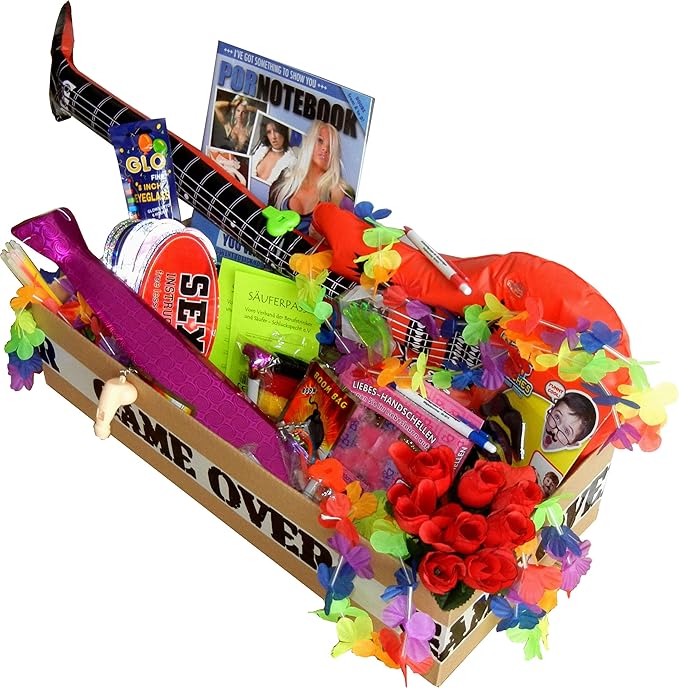 Die ultimative Party-Ausstattung für den perfekten Junggesellenabschied! Dieses 60-teilige Set enthält alles, was du für einen unvergesslichen Abend brauchst - nur der Bauchladen selbst ist nicht enthalten.\\n\\nIm Lieferumfang: Herzanhänger, Kusspass, Aufkleber, Rosenblätter, Schlüsselanhänger, Kunstrosen, Hawaiiketten, Kugelschreiber, lustige Brillen, Knicklichter, Hüte oder Masken, und viele weitere Überraschungen.\\n\\nPerfekt organisiert und sofort einsatzbereit. Mit dabei: Trinkbecher aus Pappe, Säuferpässe, Bachelorette-Armbänder und jede Menge Spaß-Artikel.\\n\\nEin Muss für jede gelungene JGA-Party! Einfach den Bauchladen besorgen, dieses Set reinpacken und die Feier kann beginnen. Garantiert für Lacher und gute Stimmung!
