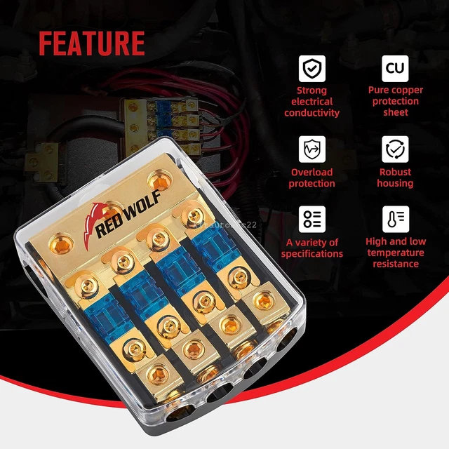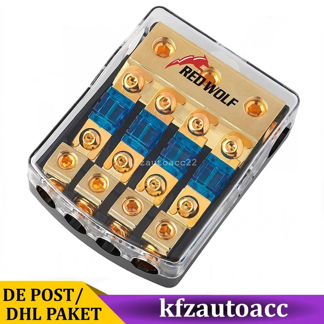 Sicherheit geht vor! Dieses 4-teilige Set mit ANL-Sicherungshaltern ist perfekt für Auto, Wohnmobil, Boot oder Solaranlagen. Jeder Halter ist für Kabel von 10-22mm² Querschnitt ausgelegt und kommt inklusive 60A Sicherung. Aus robustem Metall und Kunststoff gefertigt - geruchlos, langlebig und mit guter Leitfähigkeit. Das Steck-Design macht die Installation super einfach - einfach reinstecken und festklemmen! Kompatibel mit verschiedenen Sicherungstypen wie MidiVAL, MIDI und ANS. Die kompakte Größe passt auch in enge Räume unter dem Armaturenbrett oder im Motorraum. Perfekt für Audio-Anlagen, Zusatzbeleuchtung oder andere elektrische Verbraucher im Fahrzeug. So bist du sicher vor Kurzschlüssen und Kabelbrand! Ein Muss für jeden der an seinem Auto, Wohnmobil oder Boot elektrische Komponenten nachrüstet. Profi-Qualität zum fairen Preis - deine Elektrik ist damit bestens abgesichert!