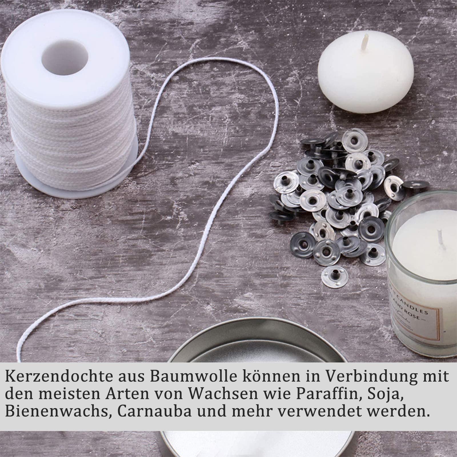 Wow, dieses Kerzendocht-Set ist ja mal komplett! 61 Meter natürlicher Baumwolldocht, 100 Metallplättchen und 1 Metallhalterung - alles was du für deine eigenen Kerzen brauchst! Der Docht ist komplett blei- und metallfrei, brennt gleichmäßig und rußfrei ab. Einfach auf die gewünschte Länge zuschneiden und gerade ziehen - verzieht sich nicht! Perfekt für Bienenwachs-, Soja-, Gel- oder Paraffinwachskerzen. Ob du Anfänger oder Profi bist - damit gelingen dir traumhafte Kerzen! Super als Geschenk für kreative Freunde oder einfach für dich selbst. Damit wird Kerzenmachen zum Kinderspiel! Einfach Wachs schmelzen, Docht rein und abkühlen lassen - schon hast du deine eigene Duftkerze!
