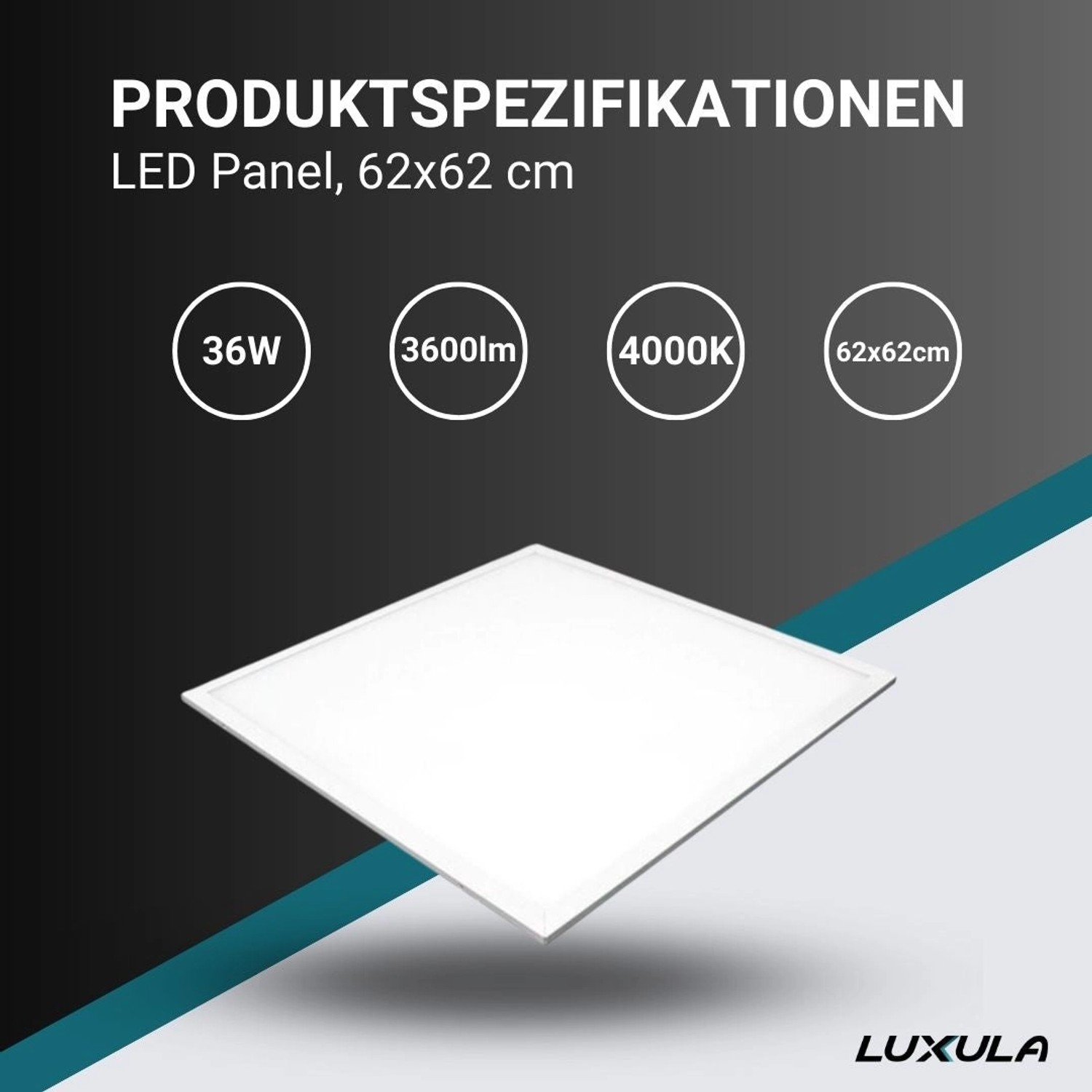 Dieses Luxula LED Panel ist die perfekte Beleuchtungslösung für dein Zuhause oder Büro! Mit 62x62 cm passt es perfekt in Standard-Rasterdecken und überzeugt mit herausragender Qualität. Die extrem lange Lebensdauer von über 50.000 Stunden macht es zur echten Investition für die Ewigkeit. Das besondere Feature: Die 4 LED-Module sind austauschbar - bei einem Defekt muss nicht gleich das ganze Panel ersetzt werden! Die Lichtfarbe lässt sich ganz einfach zwischen 3000K (warmweiß), 4000K (neutralweiß) und 6000K (kaltweiß) umstellen, sodass du die Beleuchtung deiner Stimmung anpassen kannst. Mit einer exzellenten Antiblendeigenschaft von UGR<16 und einem Abstrahlwinkel von 60x80 Grad sorgt es für eine angenehme, homogene Ausleuchtung. Vielseitige Montagemöglichkeiten - einfach in die Rasterdecke einlegen oder mit Zusatzprodukten (separat erhältlich) aufhängen. Perfekt für Wohnungen, Büros und Konferenzräume!