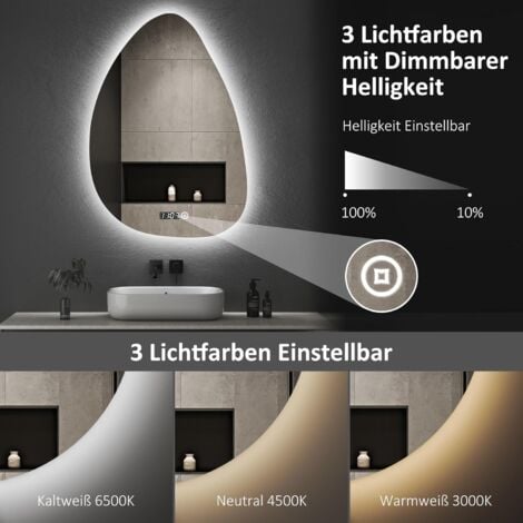 Mach dein Badezimmer zum Wohlfühl-Ort! Dieser asymmetrische LED-Spiegel sieht nicht nur super modern aus, sondern bietet auch perfekte Beleuchtung fürs Schminken, Rasieren oder Frisieren. Mit drei Lichtfarben (warmweiß 3000K, neutral 4000K, kaltweiß 6500K) findest du für jede Tageszeit und jede Stimmung die richtige Beleuchtung. Die Helligkeit lässt sich stufenlos von 10% bis 100% dimmen - perfekt für den frühen Morgen oder entspannte Abende. Der Touch-Schalter reagiert sofort und die Memory-Funktion merkt sich deine letzte Einstellung. Der hochwertige kupferfreie Silberspiegel liefert eine kristallklare Reflexion ohne Verzerrungen. Einfache Montage an der Wand, sowohl horizontal als auch vertical. Ob im Gästebad, Schlafzimmer oder Flur - dieser Spiegel setzt überall stylische Akzente und macht jede Anwendung zum Erlebnis. 62x90 cm groß - perfekt für Einzelpersonen oder Paare.