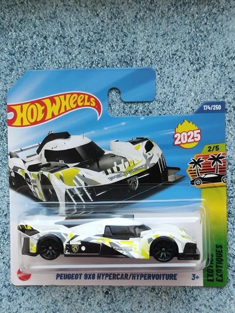 Alter, dieser Hot Wheels Peugeot 9X8 ist ja mal richtig krass geworden! Das ist dieser ultra-futuristische Rennwagen, der bei Le Mans fährt - und jetzt als detailgetreues 1:64 Modell für deine Sammlung.\\n\\nDie Lackierung in weiß-schwarz-gelb sieht einfach nur mega aus, mit allen originalen Logos und Markierungen. Jedes Detail stimmt - von den aerodynamischen Flügeln bis zur charakteristischen Front. Das ist richtige Qualität von Mattel!\\n\\nAls Teil der HW Exotics Serie 2025 ist das ein richtiges Sammlerstück. Auf der Short-Card-Verpackung sieht's besonders cool aus. Perfekt für alle, die auf Hypercars und Rennsport stehen.\\n\\nOb für dich selbst oder als Geschenk für einen Auto-Fan - damit machst du garantiert Freude. Das Modell ist robust genug zum Spielen, aber auch schön genug für die Vitrine. Achtung: Enthält kleine Teile, also nicht für Kinder unter 3 Jahren!\\n\\nWenn du die neuesten Hot Wheels haben willst, solltest du zuschlagen. Die Exotics Serien sind immer schnell weg!
