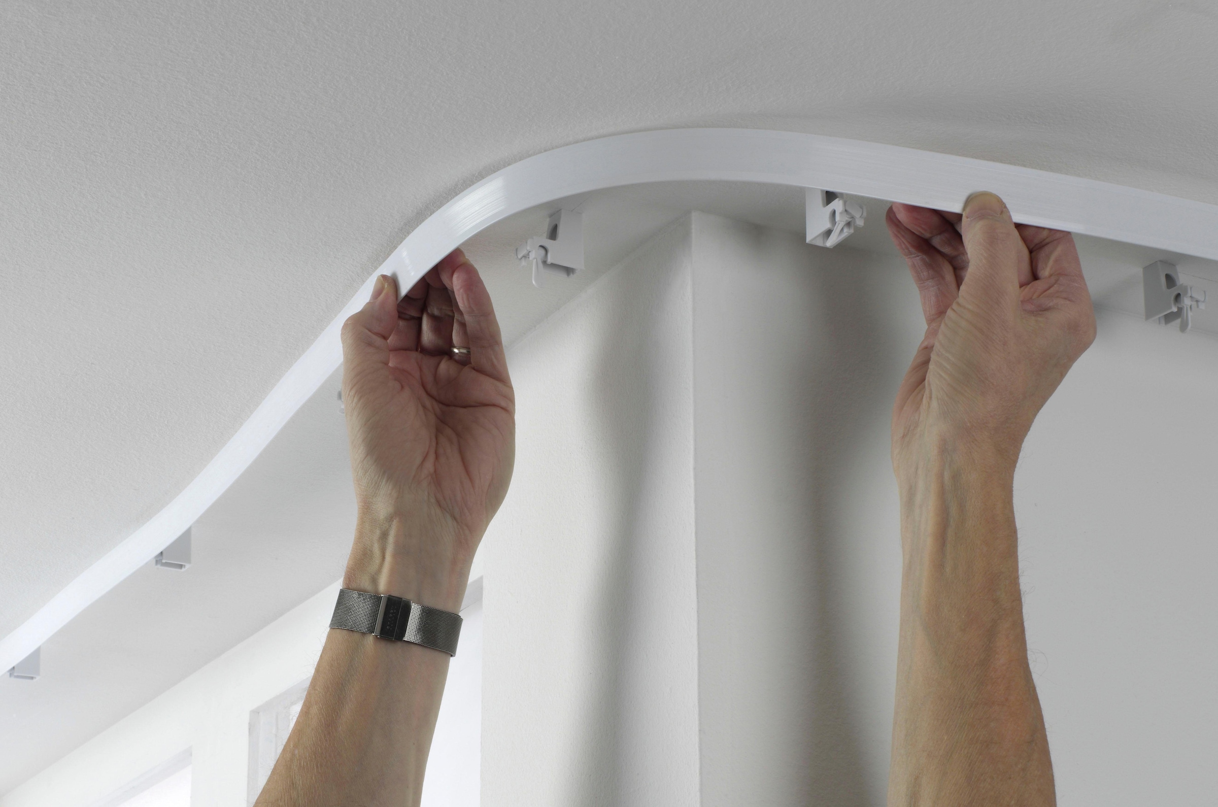 Das Material ist ein spezieller Kunststoffstahl - mega flexibel aber trotzdem stabil und langlebig. Im Lieferumfang ist wirklich alles dabei, was du brauchst: die Schiene selbst, Laufrollen (sogar 8 Stück pro Meter!), Endkappen, Halterungen und Dehnschrauben. Die Montage an der Decke ist total einfach - keine Sorge, du brauchst dafür keinen Handwerker! Einfach die Halterungen anbringen, die Rollen auf die Schiene stecken und dann die Schiene einrasten lassen. Die weiße Farbe passt zu fast jedem Einrichtungsstil und die Vorhänge gleiten super smooth. Perfekt nicht nur für Fenster, sondern auch als Raumteiler oder für Duschvorhänge!