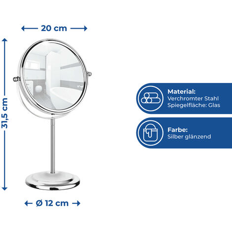 Der Spiegel ist aus verchromtem Stahl und sieht richtig edel aus. Der schwere Standfuß sorgt dafür, dass er nicht verrutscht. Und das Beste: Er ist stufenlos verstellbar - so findest du immer den perfekten Winkel.