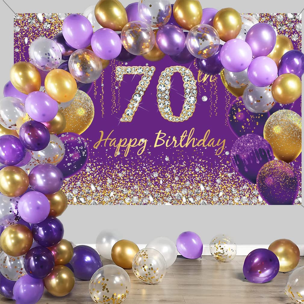 Alles Gute zum 70. Geburtstag! Mit diesem wunderschönen lila Blumen-Banner machst du jede Geburtstagsfeier unvergesslich. Das Banner ist ganze 150x90 cm groß - also richtig imposant! Aus robustem Vinyl gefertigt, das nicht reißt und lange hält. Der hochauflösende Digitaldruck sorgt für lebensechte Farben und klare Details. Mit den vier Kupferösen an den Ecken kannst du das Banner super einfach aufhängen (Seil nicht im Lieferumfang). Oder du klebst es mit Klebeband an die Wand oder das Fenster. Perfekt als Hintergrund für die Feier, als Willkommensschild, für den Tisch oder sogar als Tapete. Für drinnen und draußen geeignet! Das elegante Design mit den lila Blumen ist besonders für Frauen geeignet und hinterlässt bei allen Gästen einen bleibenden Eindruck. Einfach aufbauen, und schon sieht deine Feier aus wie beim Profi-Event-Planer! Das perfekte Geschenk für eine besondere 70. Geburtstagsfeier!