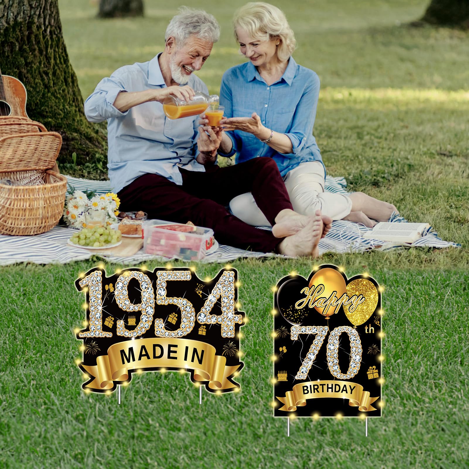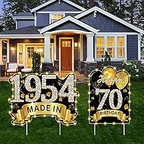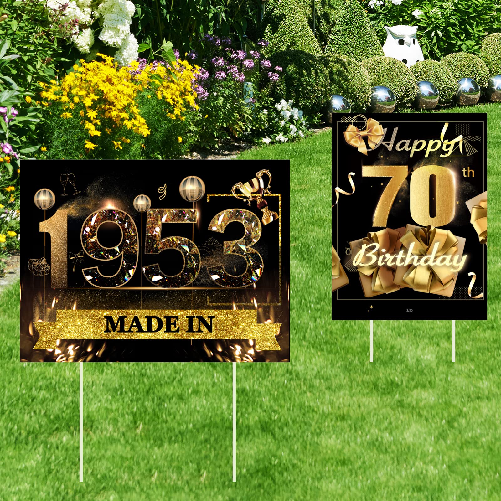Mach den 70. Geburtstag zu einem unvergesslichen Event! Diese beiden schick-schwarzen Schilder mit goldener Aufschrift 'Happy 70th Birthday' und 'Made in 1955' verwandeln jeden Garten in eine Partyzone. Komplett mit 4 praktischen Kunststoff-Heringen - einfach in den Boden stecken, und schon ist die Dekoration fertig. Aus wetterfestem Kunststoff, halten auch bei Regen stand. Die Maße von 28x40cm bzw. 40x28cm sorgen für perfekte Sichtbarkeit. Ob im Vorgarten, auf der Wiese oder am Party-Eingang - diese Schilder sind der Hingucker schlechthin. Einfach aufstellen, Gäste begrüßen und feiern! Danach platzsparend verstauen und nächstes Jahr wieder verwenden. Perfekt für Überraschungspartys und große Feiern.