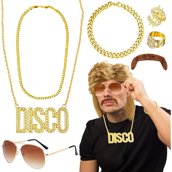Ready für die 80er Jahre? Dieses Vokuhila-Set bringt den kompletten Retro-Look! Enthalten sind eine blonde Vokuhila-Perücke, eine coole Sonnenbrille, eine goldene Halskette und ein falscher Schnurrbart - alles, was du für den perfekten 80er Style brauchst. Die Perücke fühlt sich super weich an und hat eine verstellbare Netzkopfbedeckung für optimalen Sitz. Du kannst sie sogar nach Bedarf zuschneiden. Perfekt für Fasching, Halloween, Mottopartys oder wenn du einfach mal einen anderen Look ausprobieren willst. Die braune Sonnenbrille und der Schnurrbart unterstreichen den Vintage-Charme. Einfach aufsetzen und du bist sofort in den 80ern angekommen! Super für Partys, Karneval oder als Geschenk für alle, die Spaß an Verkleidungen haben. Mit diesem Set wirst du definitiv zum Blickfang auf jeder Feier!