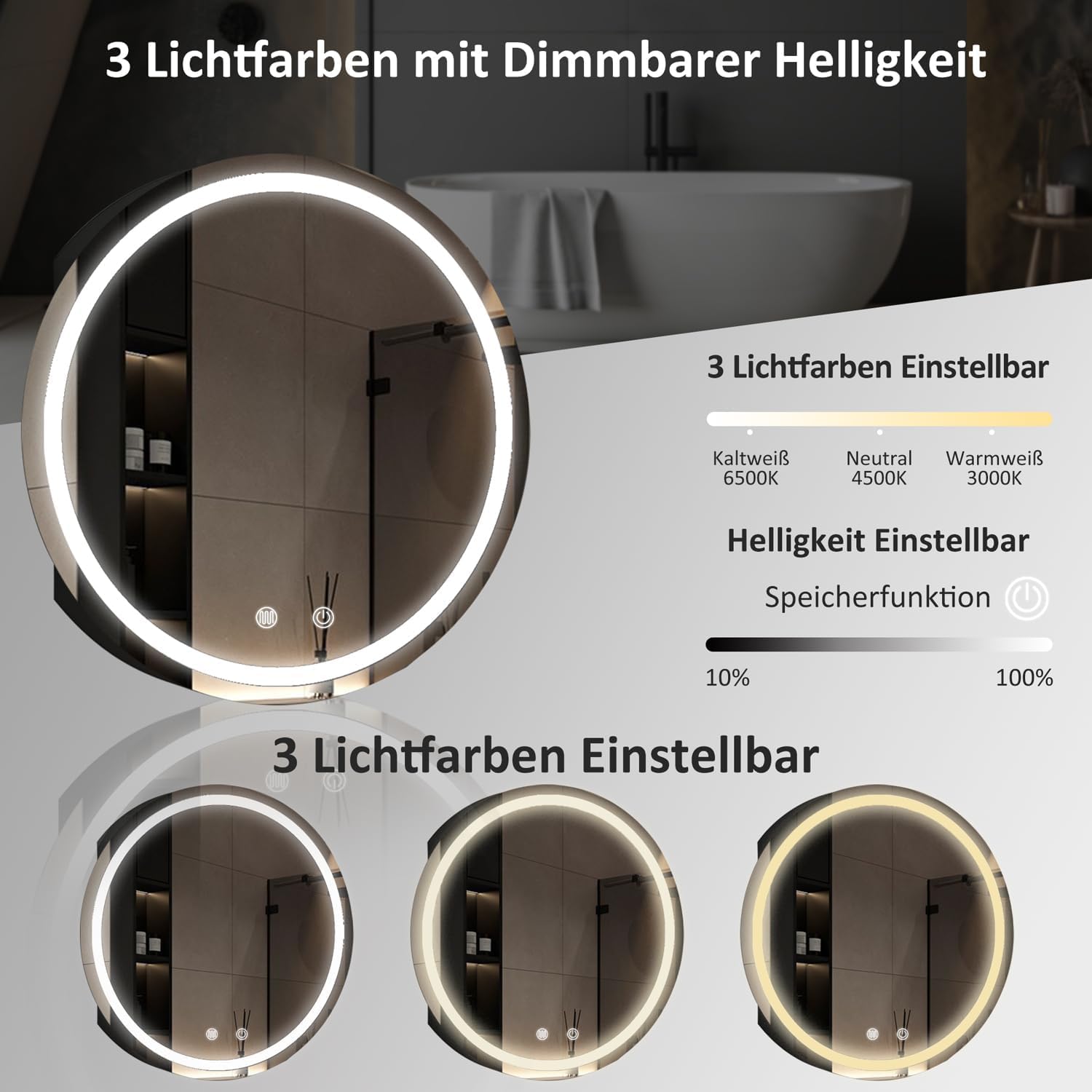 Wow, dieser runde Spiegelschrank bringt richtig Style ins Bad! Der Boromal Spiegelschrank ist nicht nur super schick, sondern auch mega praktisch. Mit 80x80x13 cm bietet er Stauraum für alle deine Badezimmer-Krimskrams - und das bei nem richtig modernen, runden Design. Das Beste: Die LED-Beleuchtung hat 3 Farbtemperaturen (Warmweiß, Neutral, Kaltweiß) und ist sogar dimmbar! Du willst morgens helles Licht zum Schminken? Kein Problem! Abends lieber gemütliches Licht? Geht auch! Und die Anti-Beschlag-Funktion ist der Hammer - nach der Dusche einfach einschalten und der Spiegel bleibt klar. Mit IP44 Schutz ist er auch für feuchte Bäder geeignet. Noch mehr Features: Steckdose an der Seite, Softclose-Scharniere und zwei Ablagefächer. Montage ist super einfach - schon vormontiert, du musst nur aufhängen und einstecken. So wird dein Bad zum Wellness-Oase!