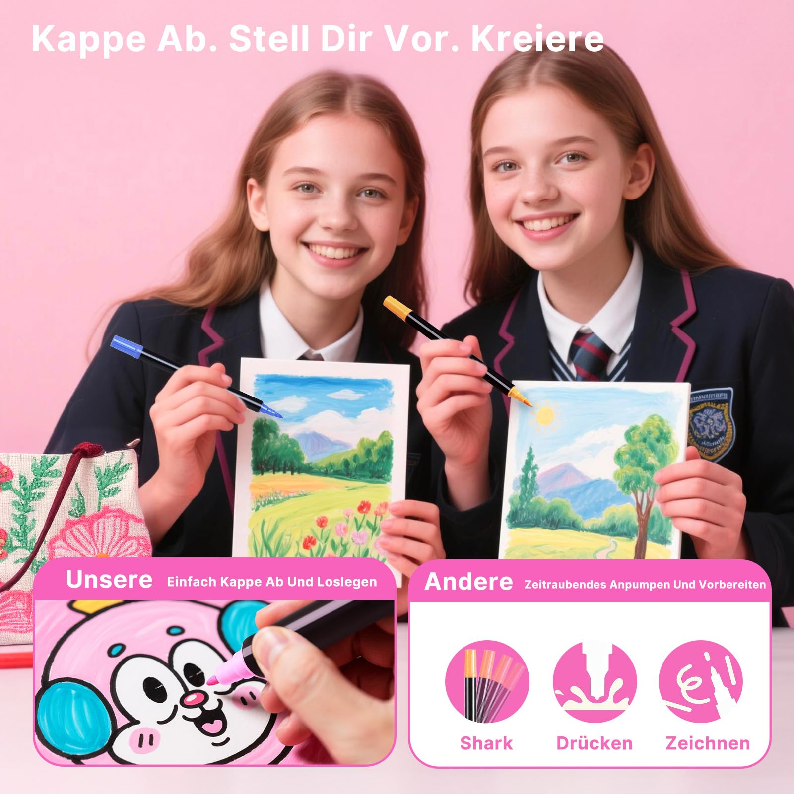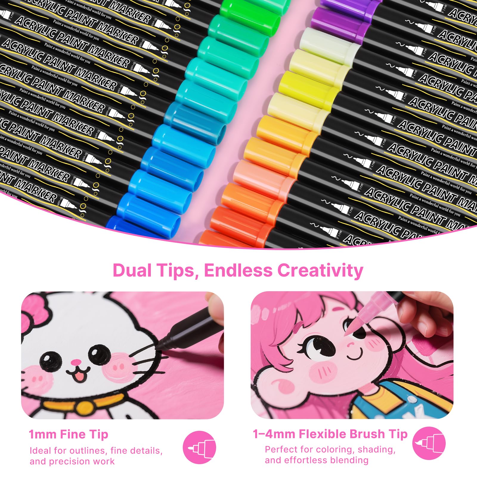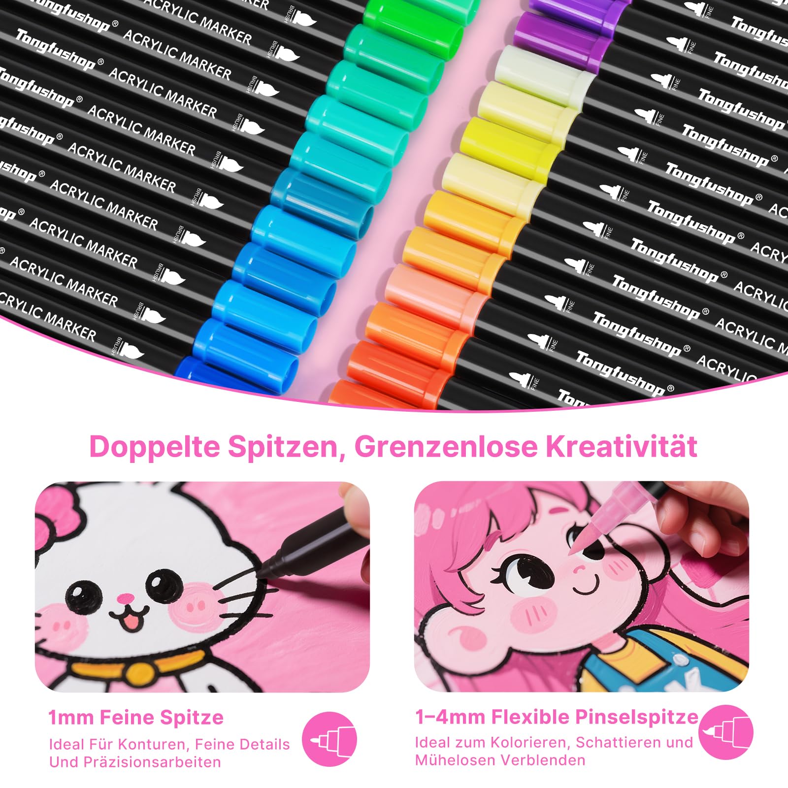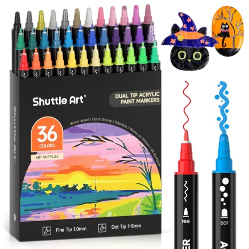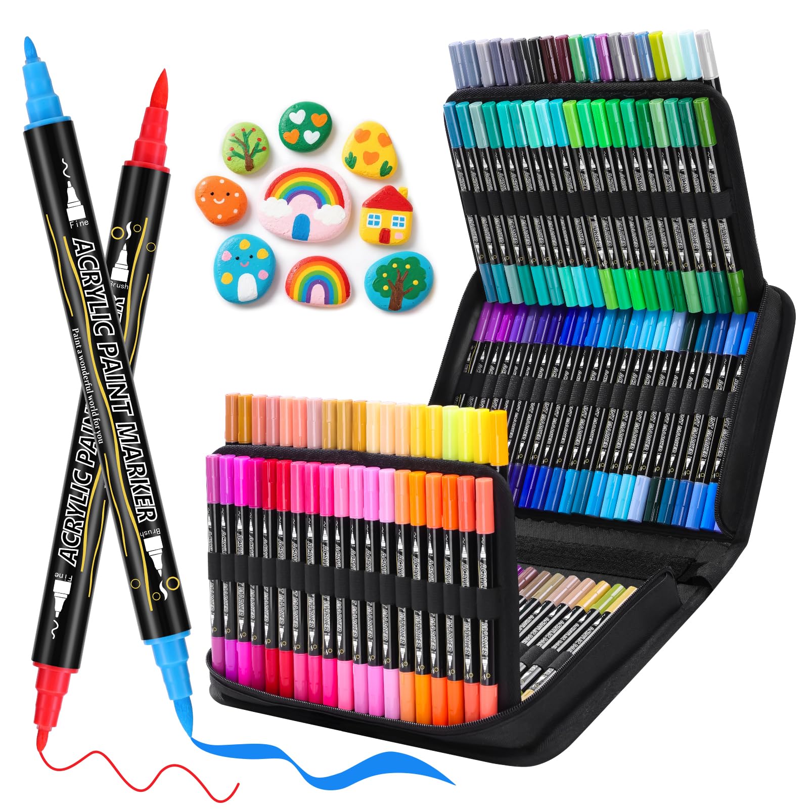 Kreativität ohne Grenzen! Dieses 84-teilige Acrylstifte-Set mit Doppelspitze ist perfekt für Steine, Glas, Holz, Keramik und Leinwand. Jeder Stift hat eine 1mm Feinspitze für Details und einen Pinsel (1-4mm) für Flächen. Hochpigmentierte, wasserfeste Tinte inklusive Metallic- und Neon-Farben. Schnelltrocknend, geruchsfrei und ungiftig. Die baumwollabsorbierenden Spitzen liefern deckende Linien ohne Vorbereitung. Komplett mit Tragetasche - ideal für Künstler, Bastler und als Geschenk. Ob für Ostern, Weihnachten oder einfach so - entfessle deine Kreativität!