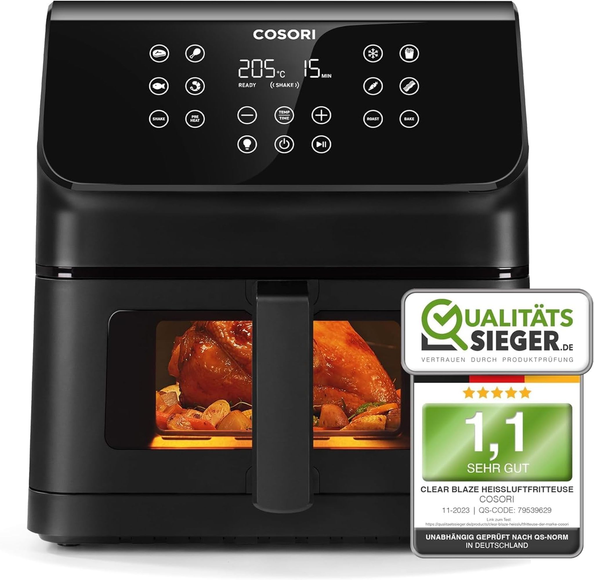 Endlich gesund frittieren für die ganze Familie! Die Berdsen Heißluftfritteuse mit riesigen 9,1 Litern Volumen und 1700W Leistung macht's möglich. Ohne Vorheizen direkt loslegen - ob knusprige Pommes, saftiges Hähnchen oder leckeres Gemüse. Mit 7 automatischen Programmen für Pommes, Pizza, Grillen, Backen und mehr. Das coole Sichtfenster mit LED-Licht zeigt dir jederzeit, wie dein Essen wird - ohne Tür öffnen! Der intuitive Touchscreen ist super einfach zu bedienen und die spülmaschinengeeigneten Teile machen das Saubermachen zum Kinderspiel. Mit Überhitzungsschutz und cool-touch Griff für absolute Sicherheit. Weniger Fett, weniger Geruch, mehr Geschmack - so macht gesunde Küche Spaß! Perfekt für Familien, Singles oder Paare - mit der Favoritenfunktion speicherst du deine Lieblingseinstellungen. Ein echter Küchenheld, der herkömmliches Frittieren überflüssig macht!