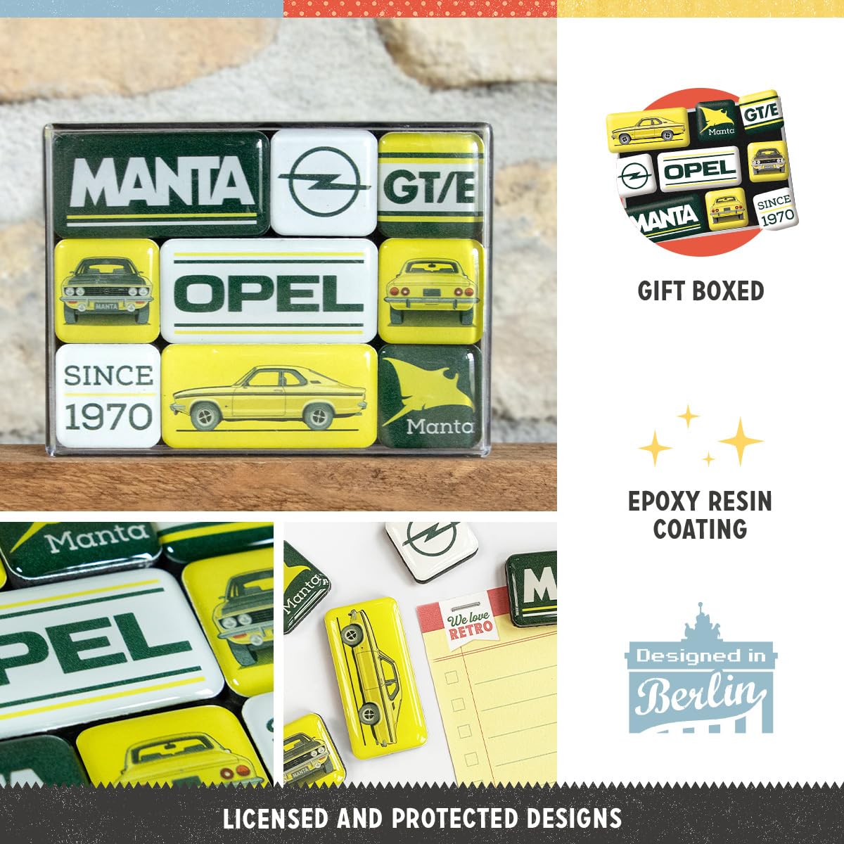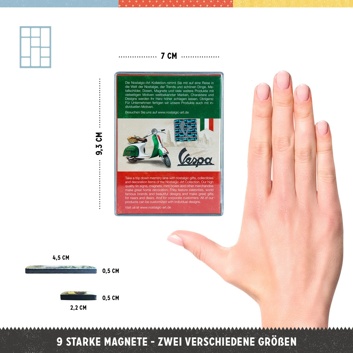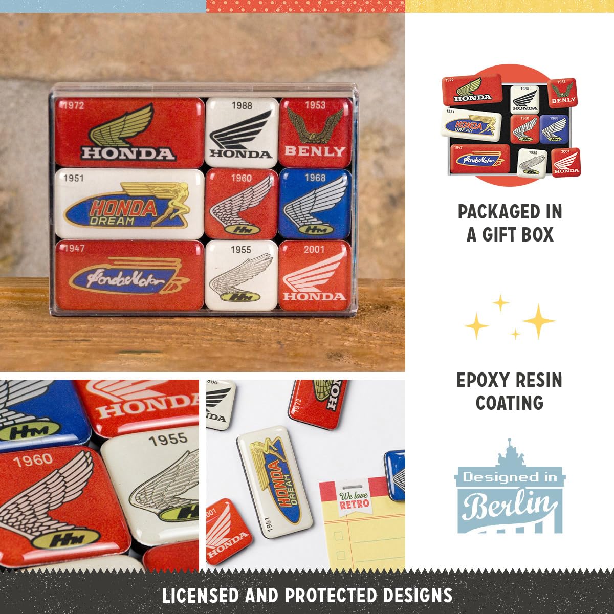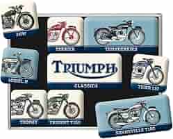 Für echte Triumph-Liebhaber! Dieses 9-teilige Magnet-Set im coolen Retro-Design ist perfekt für Motorrad-Fans. Die kleinen Kunstwerke (2,2x2,2cm und 4,5x2,2cm) sind mit Epoxidharz versiegelt und halten mit ihren starken Magneten sicher an Kühlschrank oder Magnetwand. Offiziell lizenziert und 'Designed in Berlin' - da stimmt einfach die Qualität. Die bunten Motive zeigen klassische Triumph-Modelle und bringen sofort Vintage-Flair in deine Küche. Praktisch sind sie auch: Einkaufszettel, Fotos oder der Pizzaflyer bleiben sicher hängen. Verpackt in einer transparenten Box eignen sich die Magnete super als Geschenk für Biker-Freunde oder natürlich für dich selbst. Einfach klasse Deko für jeden der Retro und Motorräder liebt!