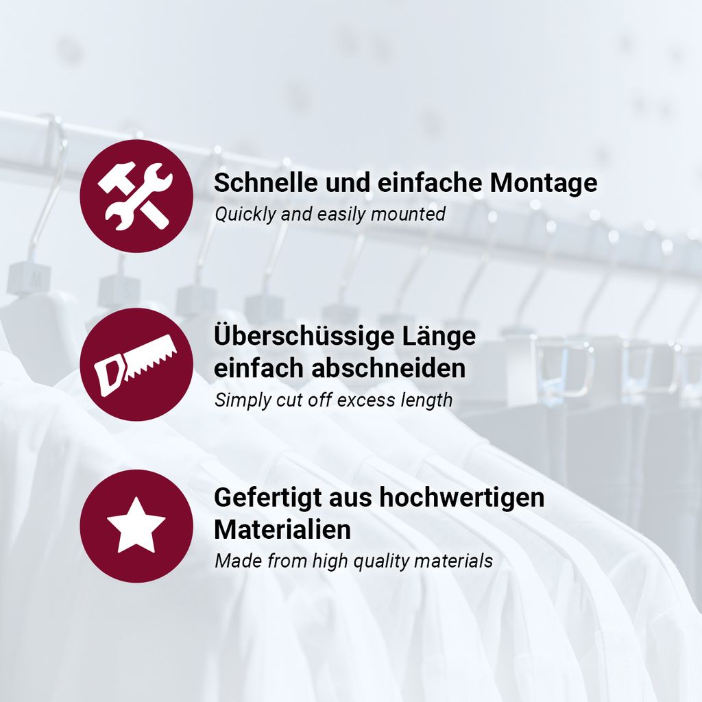 Endlich Ordnung im Schrank! Diese stabile Kleiderstange von HOOZ bringt System in deinen Kleiderschrank - ob Wand- oder Schrankmontage. \\n\\n• Länge: 90cm (auch andere Größen verfügbar) \\n• Aus hochwertigem Metall - super stabil \\n• Durchmesser: 2.5cm - trägt viel Gewicht \\n• Farbe: Silber - passt überall hin \\n• Einfache Montage mit Haltern \\n\\nHab meine endlich mal aufgeräumt! Die Stange ist echt stabil und die Halter sitzen bombenfest. Montage war in 10 Minuten erledigt. \\n\\nAuch super für Abstellkammern oder als zusätzliche Stange im Kleiderschrank. Gibt's in verschiedenen Längen! \\n\\nLieferumfang: 1x Kleiderstange + 2 Halter (ohne Schrauben)