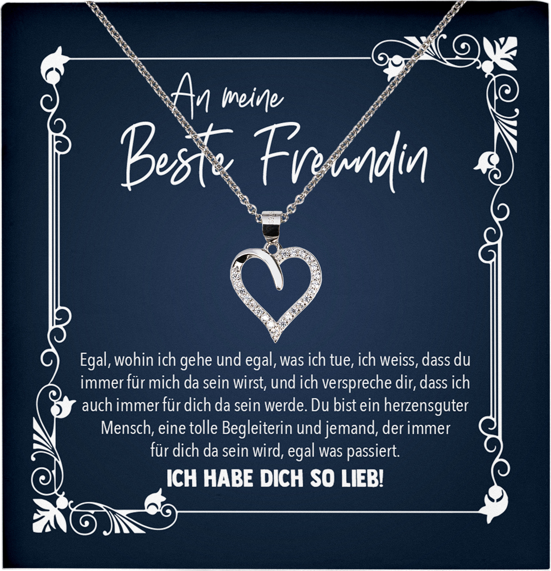 Mehr als nur Schmuck - ein Gefühl! Die 22Feels 'Seelenverwandte' Halskette sagt 'Ich liebe dich' ohne Worte. Das perfekte Geschenk für deine Liebste - ob Ehefrau, Freundin oder Verlobte.💖 Was alles dabei ist:• Herz-Anhänger aus Silber 925/000• Besetzt mit 23 funkelnden Zirkonia-Steinen• Ankerkette 45cm (verstellbar auf 42cm)• LED-Beleuchtetes Etui aus PU-Leder• Geschenktasche mit Schleife• Persönliche Grußkarte• Poliertuch und Samtbeutel• Emotionale Botschaftskarte (Made in Germany)Produktdetails:• Material: Sterlingsilber 925, rhodiniert• Herzgröße: ca. 14,5 x 14,5 mm• Kettenbreite: ca. 1,3 mm• Gewicht: ca. 2,40 grammDas Besondere: Das Etui hat eingebaute LED-Beleuchtung! Wenn sie es öffnet, leuchtet die Kette sofort in vollem Glanz - ein echter Wow-Moment!🎁 Perfekt für:• Valentinstag• Hochzeitstag• Jahrestag• Geburtstag• Einfach-so-aus-Liebe-GeschenkDie Kette ist nickel- und cadmiumfrei - ideal auch für empfindliche Haut. Das Herz-Symbol ist zeitlos schön und passt zu jedem Outfit. Ob im Alltag oder zum besonderen Anlass - diese Kette erinnert sie immer an deine Liebe.💕 Warum dieses Geschenk so besonders ist: Alles ist durchdacht - von der luxuriösen Verpackung bis zur persönlichen Karte. Du brauchst nichts mehr dazu kaufen, alles ist bereits im Set enthalten. Einfach die persönliche Nachricht auf die Grußkarte schreiben und überreichen - mehr Romantik geht kaum! Made in Germany Qualität, die man sieht und fühlt.