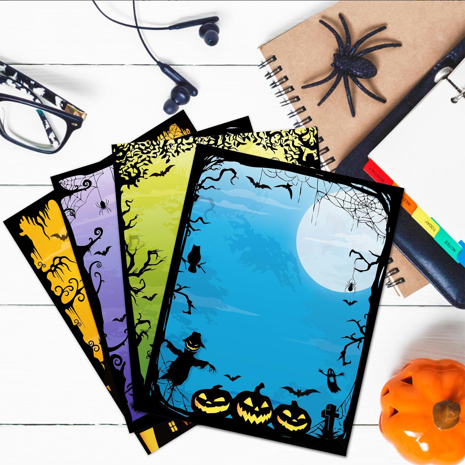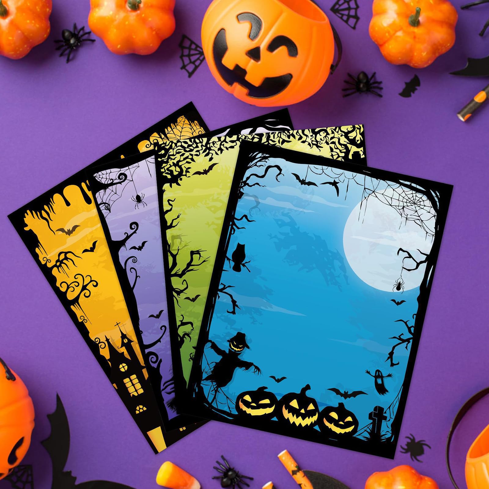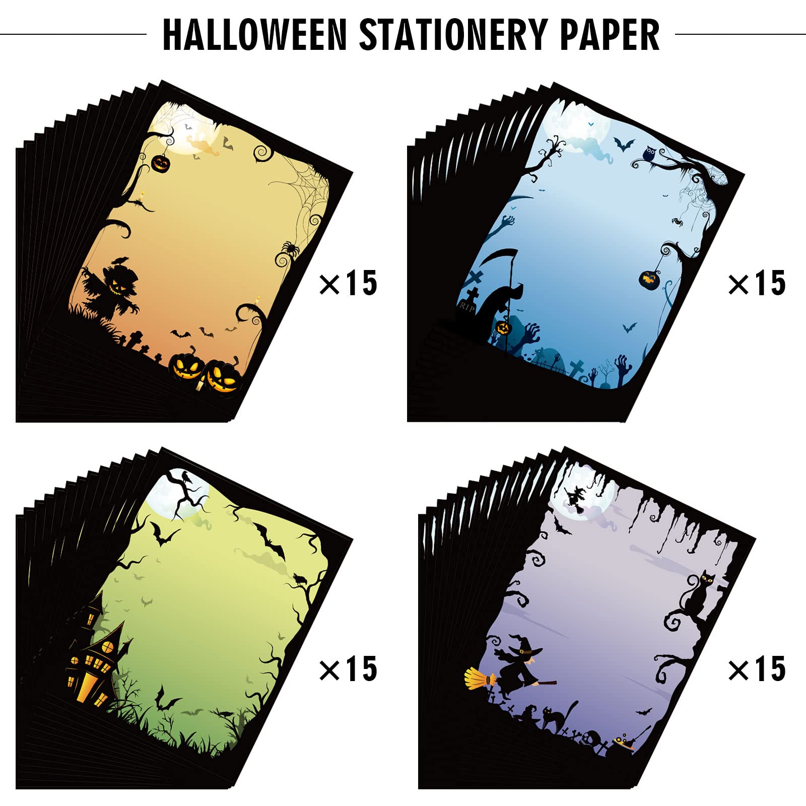 Total gruselig-cooles Briefpapier für Halloween! 60 Blatt im Pack mit 4 verschiedenen Designs - je 15 Blatt von jedem Motiv. Mit Grusel-Monstern, Fledermäusen, Kürbissen und anderen Halloween-Figuren. Standardgröße 27,9x21,6cm (A4) - perfekt für Drucker und zum Schreiben. Doppelseitig bedruckt, also doppelt so viel Platz für deine gruseligen Botschaften! Aus hochwertigem Papier, nicht zu dünn, nicht zu dick - ideal für Stift oder Drucker. Super für Halloween-Einladungen, Grußkarten, Schulprojekte oder einfach nur zum Basteln. Mach deine Halloween-Korrespondenz zu etwas Besonderem! Auch gut für Büro oder Schule - wo auch immer du Gruselstimmung verbreiten willst!