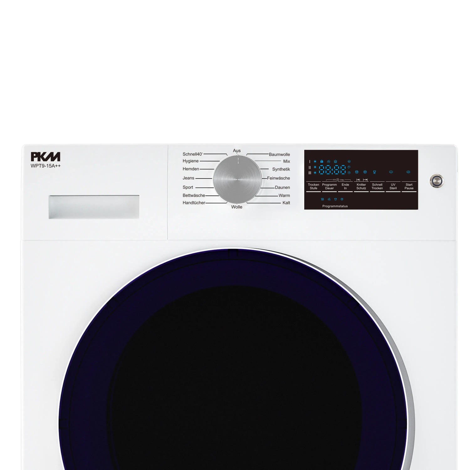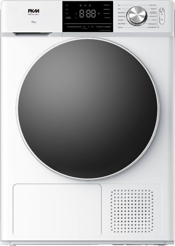 Der PKM Wärmepumpentrockner WPT10-14A++ trocknet deine Wäsche energiesparend und schonend! Mit 10kg Fassungsvermögen ideal für große Haushalte. A++ Energieeffizienz spart Stromkosten.\\n\\nViele Programme für Baumwolle, Synthetik und empfindliche Textilien. LED-Display mit Touch-Bedienung für komfortable Steuerung. Knitterschutz-Programm reduziert Falten. Selbstreinigender Kondensator minimiert Wartungsaufwand. Innovatives Wärmepumpensystem für gleichmäßige Trocknung bei niedrigen Temperaturen. Perfekt für anspruchsvolle Haushalte!