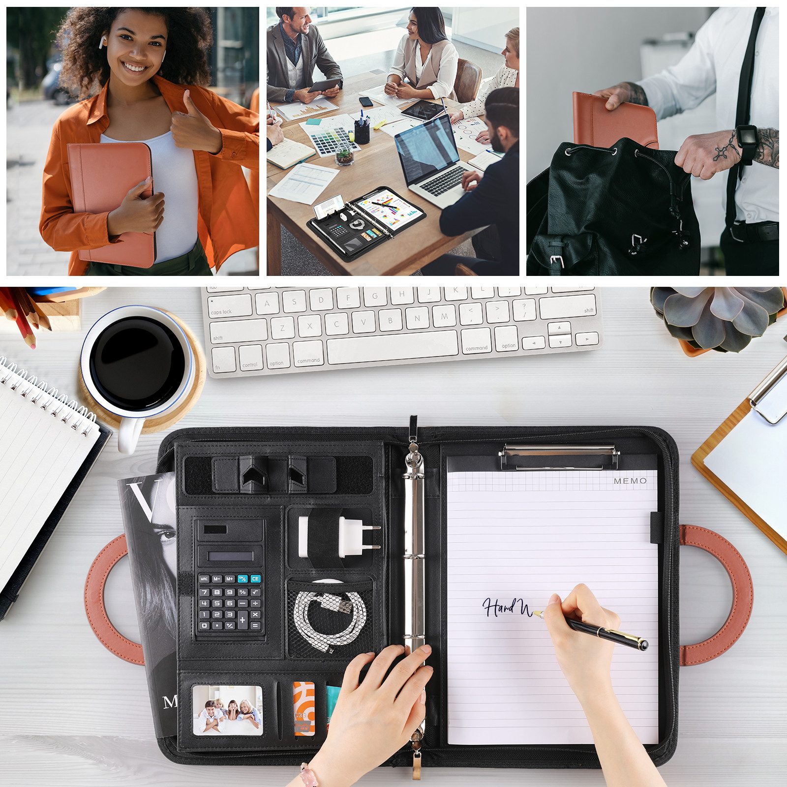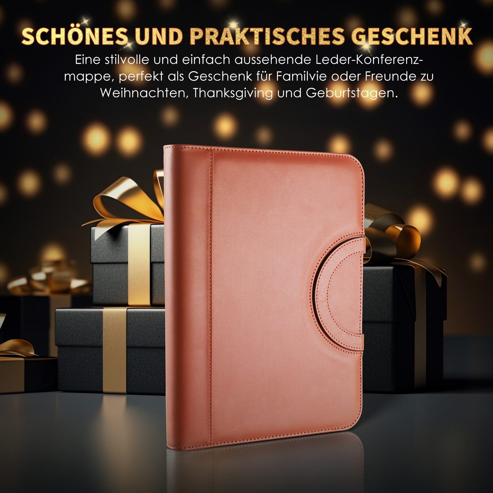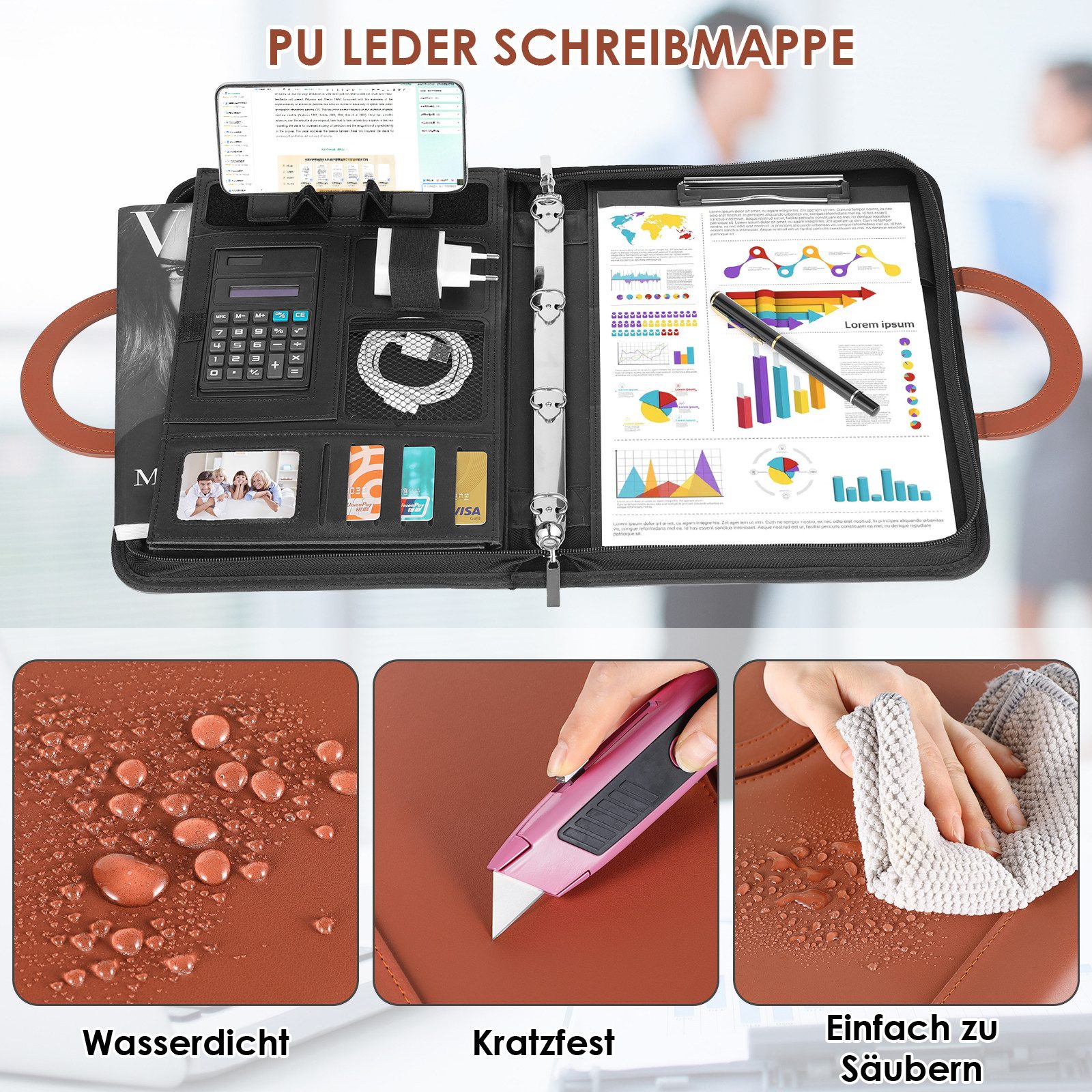 Perfekt organisiert für jedes Business-Meeting! Diese stylische A4-Schreibmappe in brauner Lederoptik ist dein zuverlässiger Begleiter für Termine, Konferenzen und Geschäftsreisen. Mit praktischem Reißverschluss schützt sie deine wichtigen Unterlagen vor Regen, Staub und Kaffeeflecken. Das coole Feature: Ein integrierter Handy- und iPad-Halter, damit du bei Videocalls immer beide Hände frei hast. Innen findest du alles was du brauchst: 26-seitigen Notizblock, Taschenrechner, Markierstift, 4 Ringbuchklammern, 6 Kartenfächer für Visitenkarten und Kreditkarten, plus 10 Klarsichthüllen für Dokumente. Sogar eine Netztasche für Ladekabel ist dabei! Mit den Maßen 34x25x4,4 cm passt alles rein was wichtig ist - ob A4-Unterlagen, Tablets oder Zeitschriften. Aus hochwertigem PU-Leder, das sich super leicht reinigen lässt. Sieht nicht nur professionell aus, sondern ist auch mega praktisch!
