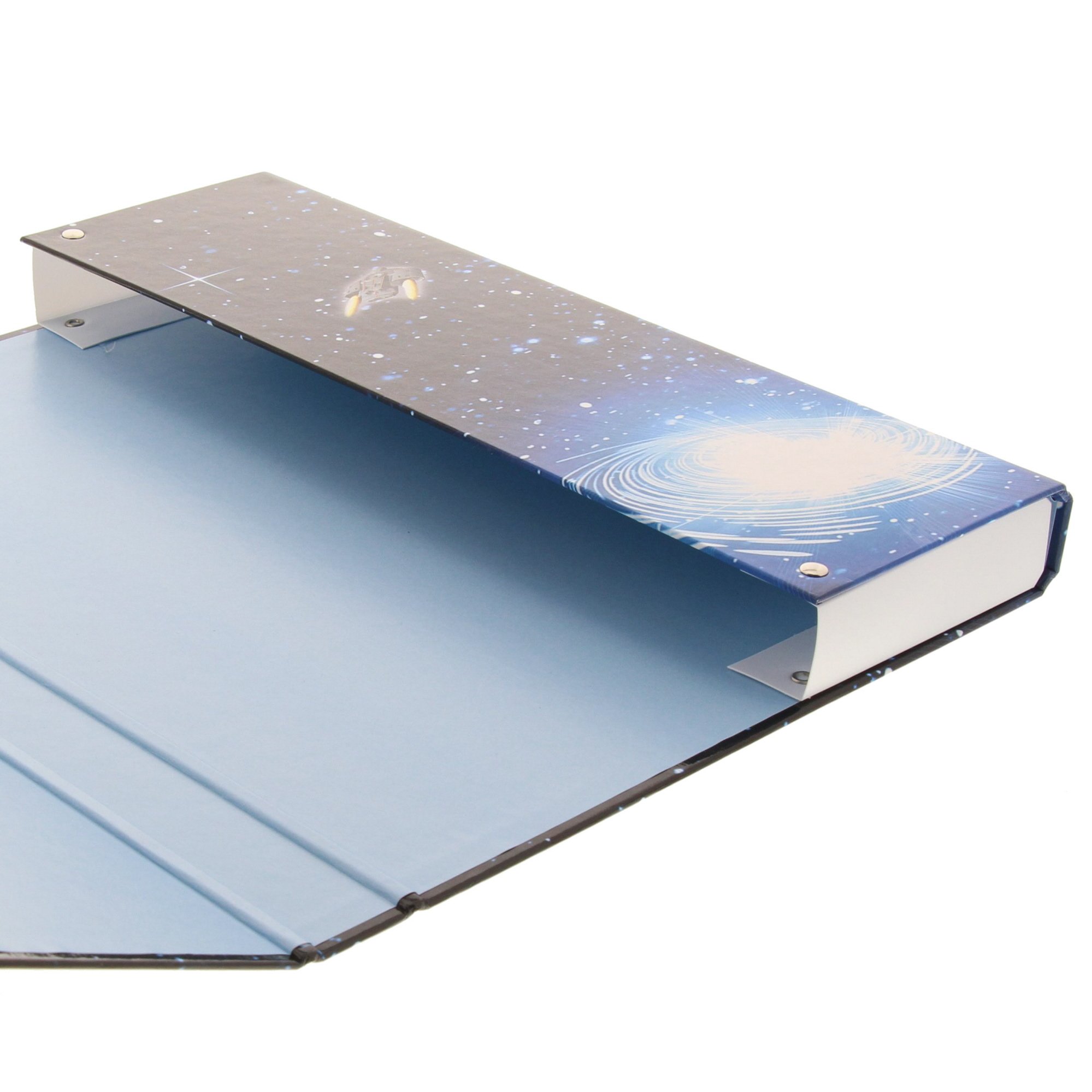 Deine Hefte und Unterlagen verdienen den besten Schutz! Diese coole goldbuch Heftbox im Raumschiff-Design ist nicht nur super stylisch, sondern auch praktisch. Im DIN A4 Format passt alles rein - Hefte, Blöcke, losen Blätter oder wichtige Dokumente.\\n\\nDie stabile Box schützt deine Unterlagen zuverlässig vor Knicken und Schmutz, wenn du sie in der Schultasche oder im Rucksack transportierst. Der flexible Innenteil bietet Platz für bis zu 3,7cm Materialstärke.\\n\\nHergestellt in Deutschland aus laminiertem Kunstdruck, ist die Box besonders robust und langlebig. Die glatte Oberfläche fühlt sich toll an und ist gleichzeitig unempfindlich gegen Flecken.\\n\\nMit den Maßen 24x32cm ist sie kompakt genug für jeden Rucksack, aber groß genug für alle Standard-Hefte. Das Weltraum-Design in Dunkelblau/Schwarz begeistert nicht nur Kinder, sondern auch alle, die es etwas ausgefallener mögen. Qualität, die man sieht und fühlt!