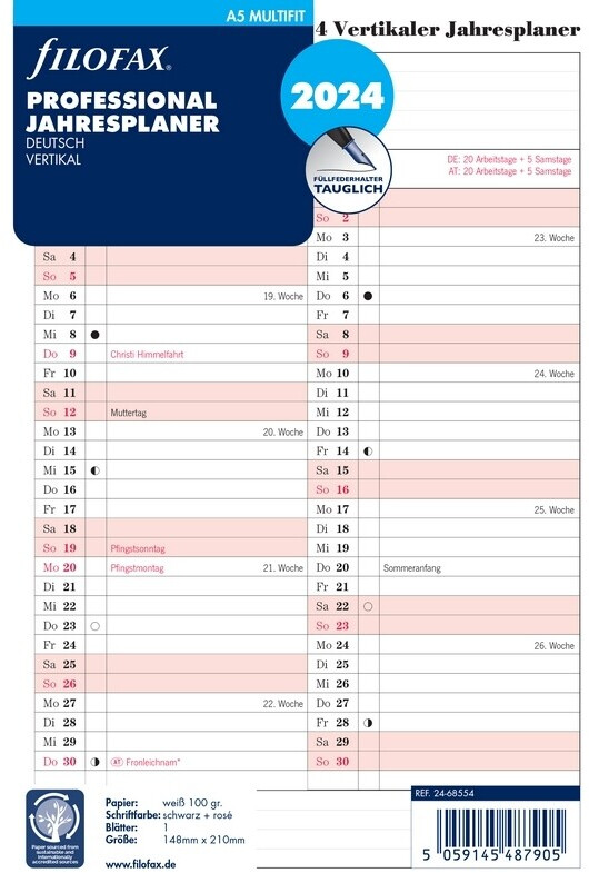 Perfekt organisiert durchs Jahr 2026! Diese Chronoplan Kalendereinlage im handlichen A5-Format (148x210mm) gibt dir den perfekten Überblick über das ganze Jahr. Jeder Monat hat eine eigene Seite, die sich praktisch ausklappen lässt - dank Leporello-Falzung bleibt alles schön übersichtlich. Auf hochwertigem, extra starkem Papier (120g/m²) gedruckt, das angenehm in der Hand liegt. FSC-zertifiziert und damit umweltfreundlich. Die Universal-Lochung passt in die meisten gängigen Terminplaner - ob für Büro, Studium oder privat. Mit Zweifarbdruck für bessere Lesbarkeit und gegen unerwünschtes Ausreißen verstärkt. Einfach in deinen bestehenden Organizer einlegen und schon kannst du alle wichtigen Termine, Geburtstage und Events auf einen Blick sehen. Die ideale Ergänzung für alle, die ihr Leben gut organisiert haben wollen!