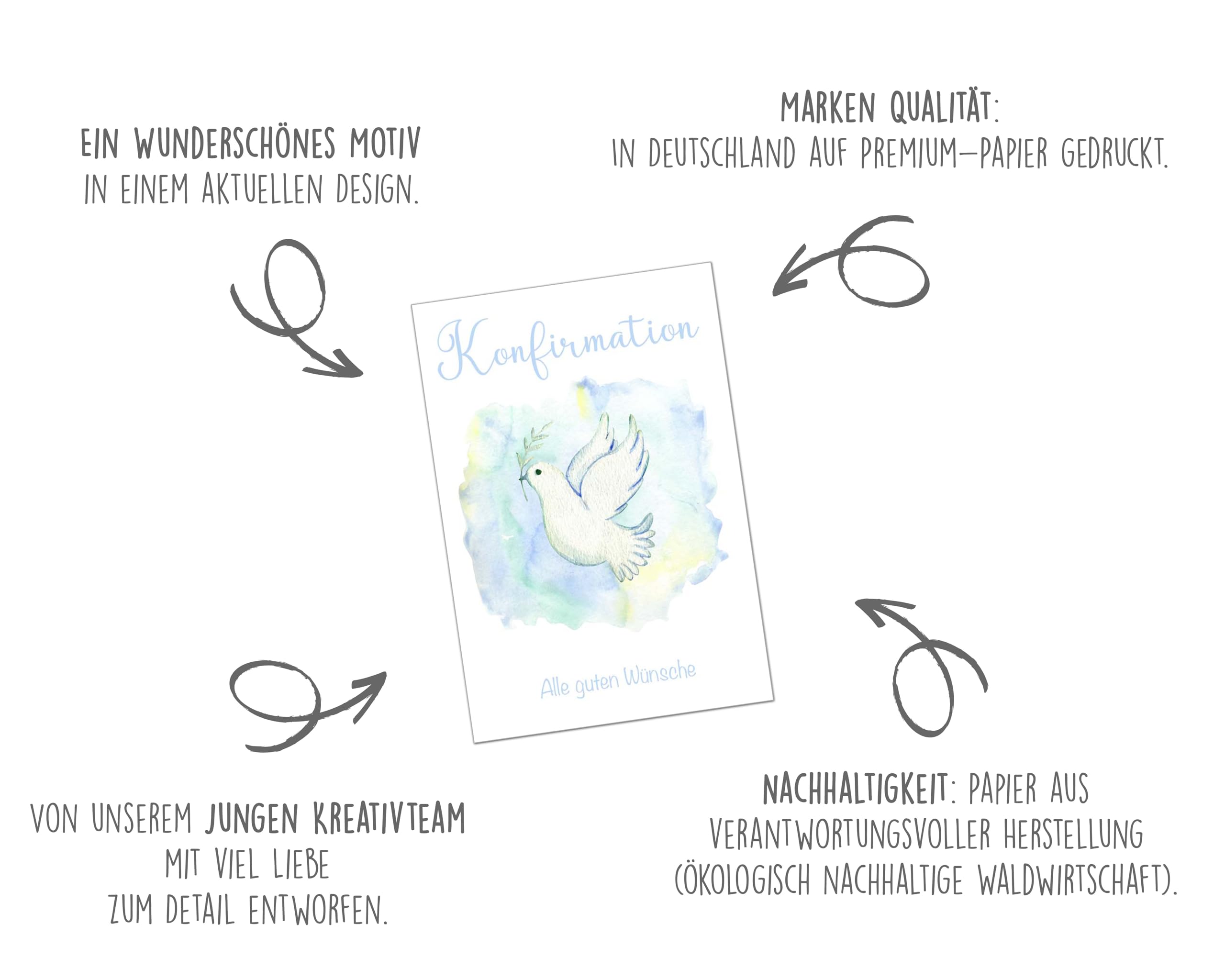 Diese wunderschöne Konfirmationskarte überzeugt mit modernem Aquarell-Design in Blautönen und christlichen Fischsymbolen. A6 Format (14,8x10,5cm) auf hochwertigem 300g/m² Naturpapier. Mit passendem Kraftpapier-Umschlag - perfekt für Geldgeschenke oder persönliche Wünsche. Made in Germany mit Liebe zum Detail. Schafft eine bleibende Erinnerung an diesen besondenen Tag. Elegant, modern und voller Bedeutung - die ideale Karte zur Konfirmation!
