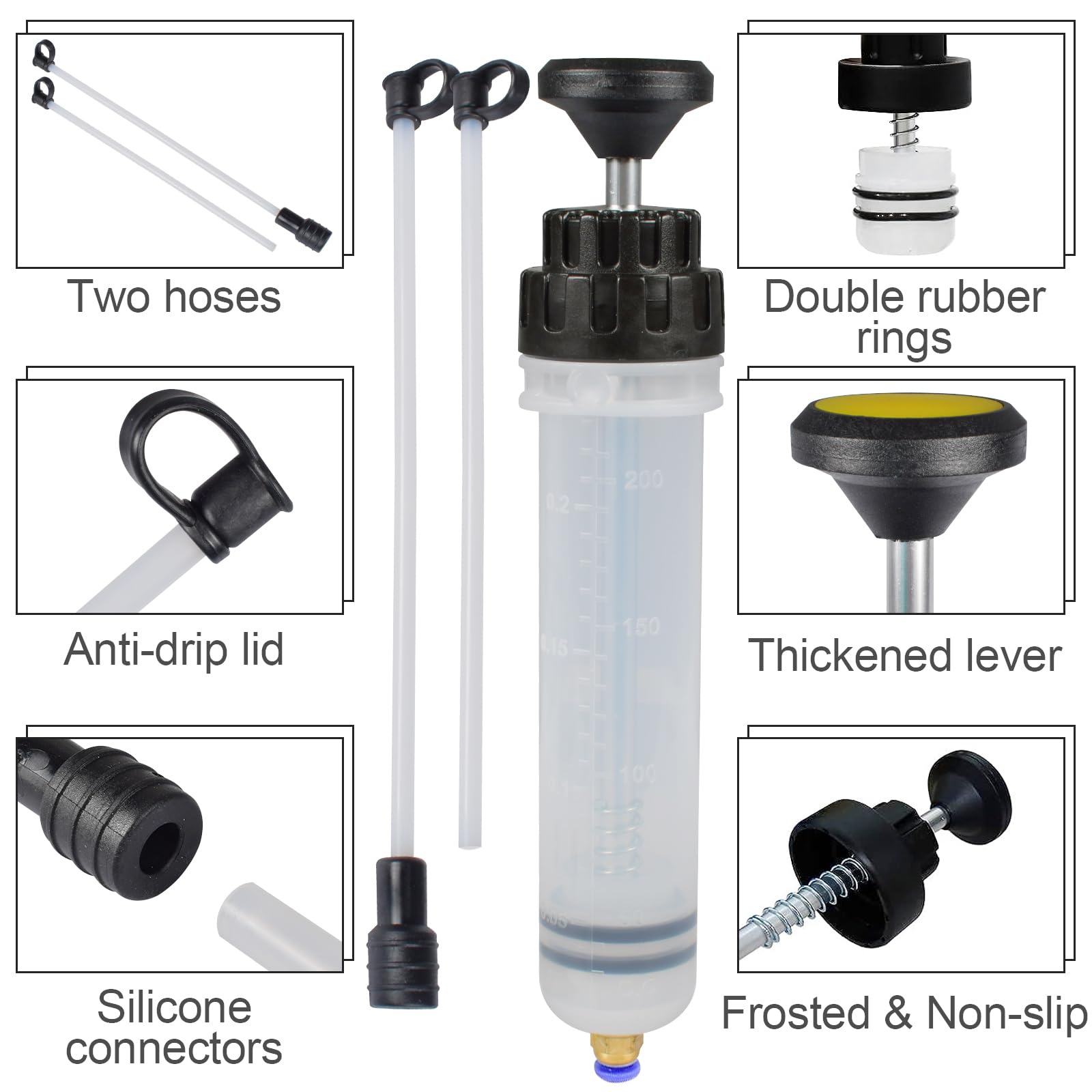 Diese Ölabsaugpumpe ist ein echter Allrounder für jede Werkstatt! Mit 200ml Fassungsvermögen und zwei Schläuchen kommst du auch an schwer erreichbare Stellen. Perfekt für Bremsflüssigkeit, Motoröl, Kühlmittel oder Hydrauliköl. Die transparente Ausführung mit Skala zeigt genau an, wie viel Flüssigkeit du absaugst. Aus robustem Kunststoff und Aluminium - hält lange und ist leicht zu reinigen. Dank doppelter Gummidichtung absolut dicht, keine lästigen Lecks! Ob für Auto, Motorrad oder Boot - diese Pumpe macht das Wechseln von Flüssigkeiten zum Kinderspiel. Einfach in der Handhabung und wiederverwendbar - ein Muss für jeden Heimwerker!