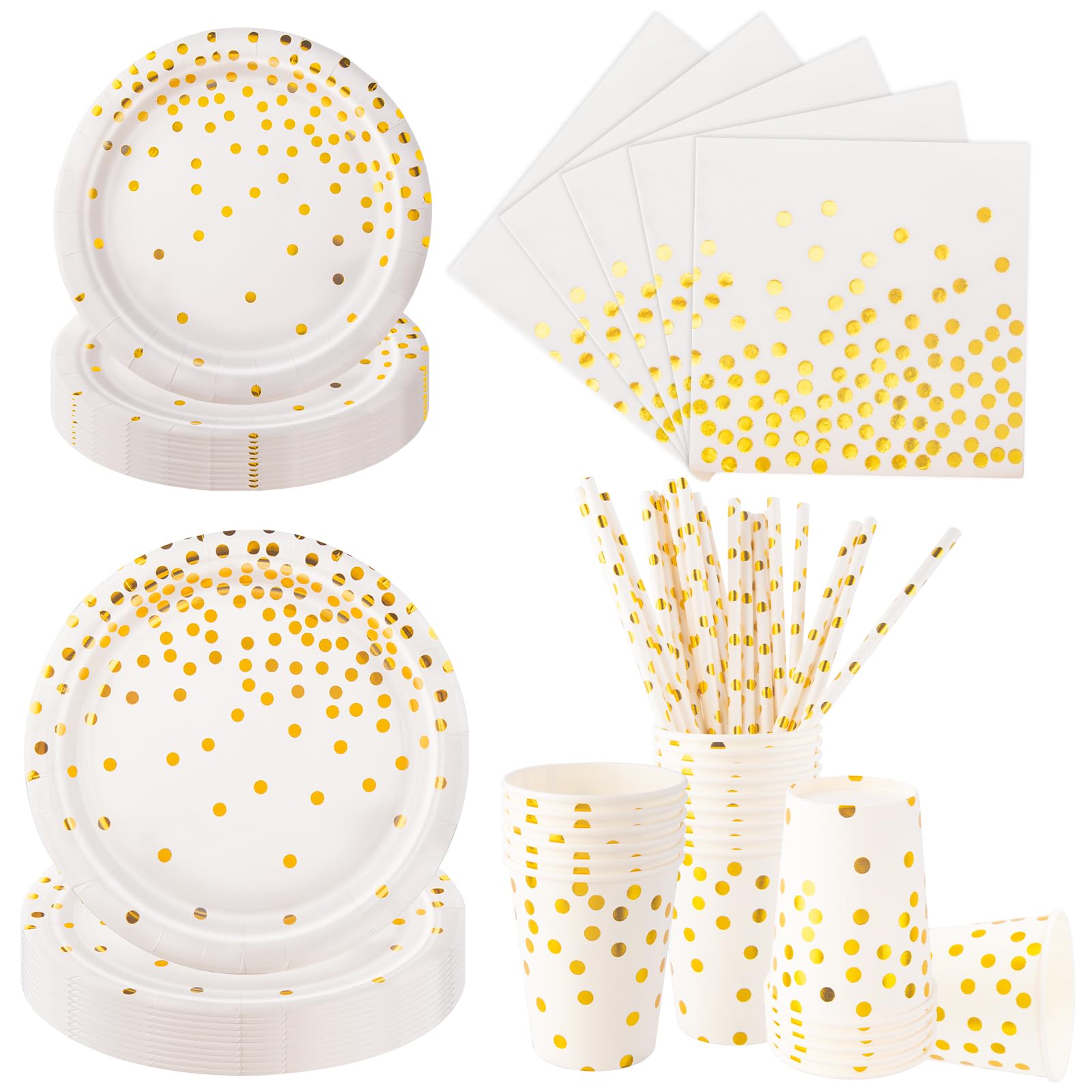 Enthalten: 25x 9-Zoll-Teller, 25x 7-Zoll-Teller, 25 Becher, 25 Servietten, 25 Strohhalme, 25 Holzlöffel, 25 Holzgabeln plus eine grosse Tischdecke. In dekorativem Gold/Weiss-Design mit blattgrünen Akzenten.