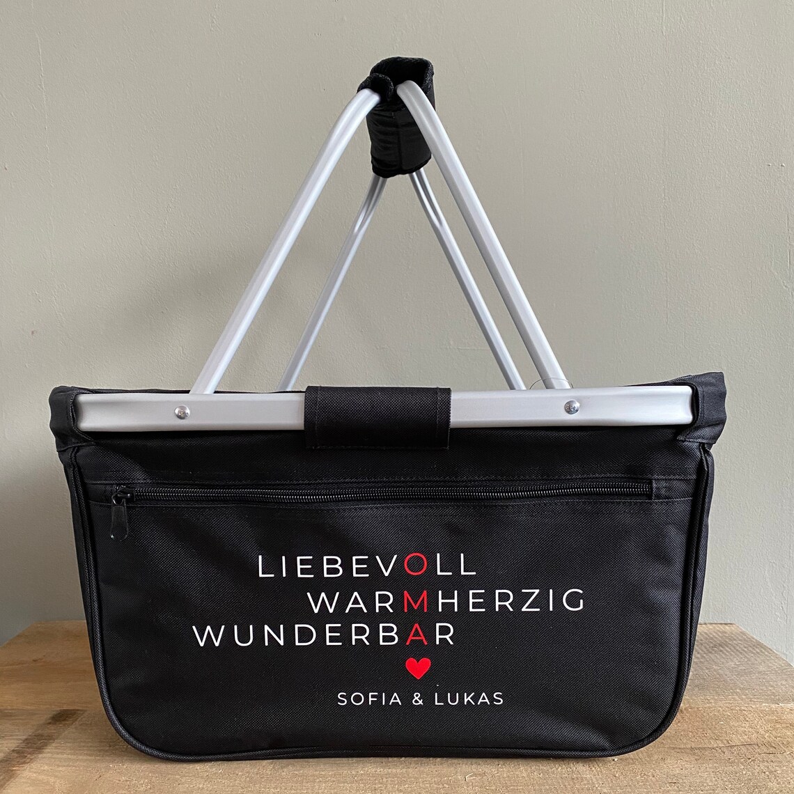Dieser personalisierte Einkaufskorb ist das perfekte Geschenk für deine Mama! Mit individuellem Namen wird er zu etwas ganz Besonderem - einfach vor dem Kauf personalisieren. Aus robustem Navy-Stoff mit stabilem Alurahmen, der trotzdem leicht ist. 20 Liter Fassungsvermögen - ideal für den Wocheneinkauf oder Marktbesuch. Mit praktischen Standfüßen steht er sicher am Boden. Der ergonomische Griff liegt super in der Hand, auch bei vollem Korb. Und das Beste: Er ist faltbar! Nach dem Einkauf einfach zusammenklappen und platzsparend im Auto oder Schrank verstauen. Vielseitig einsetzbar: nicht nur für Einkäufe, sondern auch für Picknicks, Camping oder als Aufbewahrungskorb zuhause. Ein richtig praktisches Geschenk zu Muttertag, Geburtstag oder einfach so - deine Mama wird sich freuen!