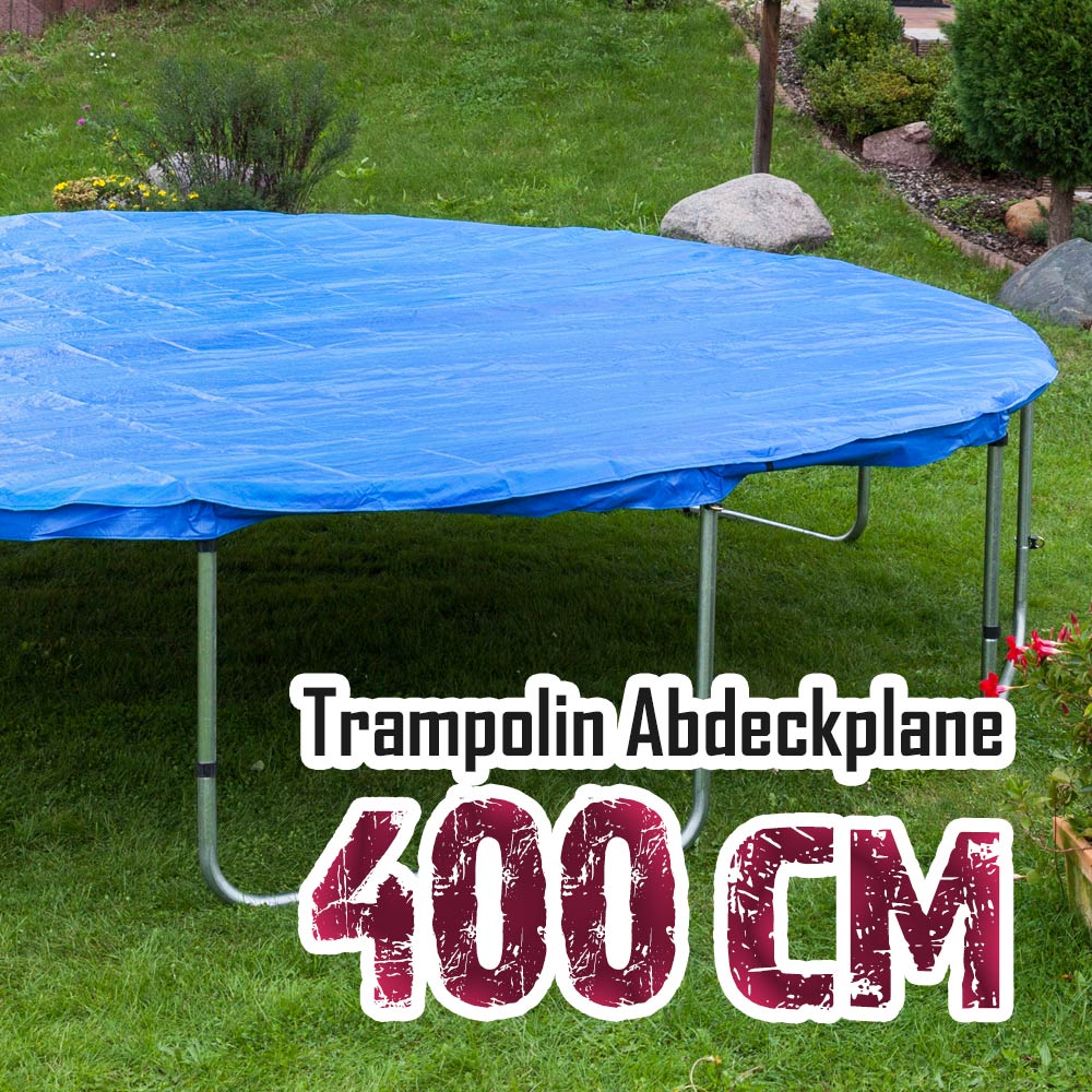 Mit 400cm Durchmesser passt sie perfekt auf die meisten Rundtrampoline. Die praktischen Karabinerhaken mit Gummizug sorgen für sicheren Halt auch bei Wind und Wetter.