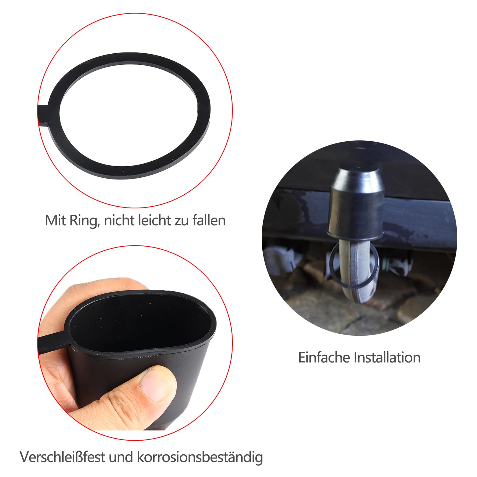 Diese Anhängerkupplungs-Abdeckungen sind total praktisch! Schützen deine Kugelkupplung vor Rost, Korrosion, Fett und Schmutz. Aus hochwertigem Kunststoff - wasserdicht, reißfest und mega langlebig. Der Sicherungsring sorgt dafür, dass die Abdeckung nicht verloren geht. Maße: 70mm hoch, 52mm Durchmesser unten - passt perfekt auf Standard-50mm-Kugelköpfe. Einfach aufstecken, fertig! Kein Werkzeug nötig. Super für alle Autos, Wohnmobile, LKWs, Anhänger und Boote. Stell dir vor: Keine fettigen Hosen mehr, wenn du aus Versehen an die Kupplung kommst! Und wenn das Auto geparkt ist, dient die Abdeckung sogar als Mini-Stoßstange beim Waschen. Im Set sind 4 Stück - ideal wenn mal eine kaputt geht oder du mehrere Fahrzeuge hast. Die schwarze Farbe sieht einfach clean aus. Ein kleines Teil, das echt viel Ärger spart! Einfach bestellen, aufstecken und dich über eine saubere Kupplung freuen. So simpel kann Autopflege sein!