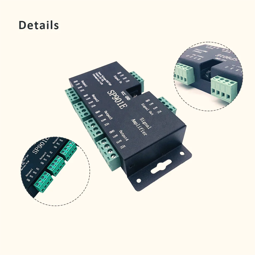 Für alle LED-Begeisterten! Dieser Signalverstärker ist der Game-Changer für deine Lichtprojekte. Mit 5 Verstärkern im Set kannst du endlich lange LED-Streifen ohne Signalverlust betreiben. Kompatibel mit so gut wie allen gängigen LED-Typen: WS2812B, WS2811, SK6812, WS2813, APA102 und vielen mehr. Arbeitet mit 5V bis 24V - aber Achtung: Die Ausgangsspannung muss zur LED-Spannung passen! Jeder Verstärker hat 8 Ausgänge für Single-Daten-Leitungen oder 4 Ausgänge für Daten+Takt-Leitungen. Super praktisch: Mehrere Verstärker können miteinander verbunden werden. Perfekt für mittlere bis große Beleuchtungsprojekte. Arbeitstemperatur von -20 bis +60°C - hält also so einiges aus. Aus robustem Metall gefertigt, 140x56x28mm groß. Wichtig: Das ist nur der Verstärker, du brauchst zusätzlich einen Controller! Aber mit diesem Teil werden deine LED-Projekte erst so richtig professionell.