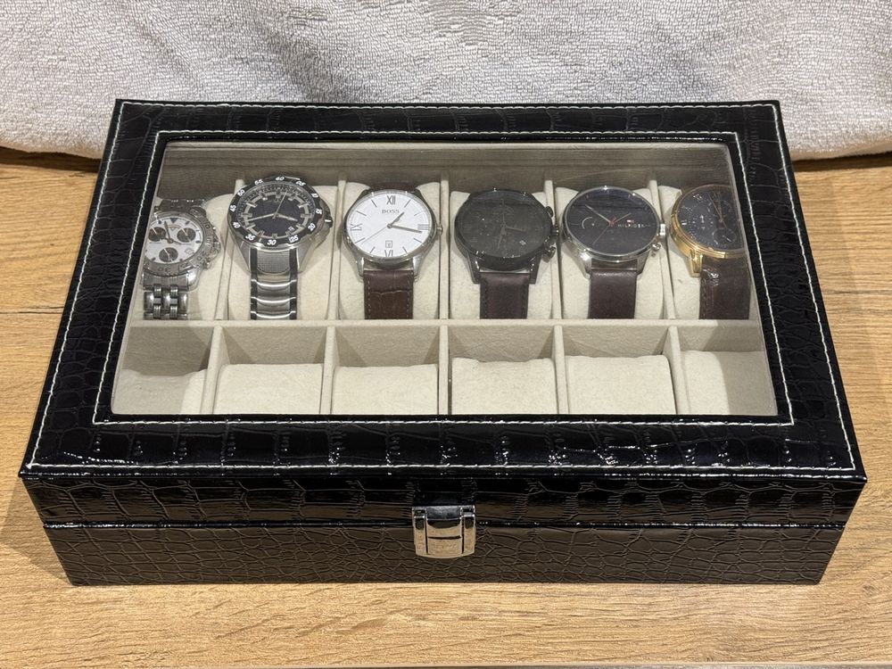 Präsentiere deine wertvollen Uhren in Style! Diese elegante Uhrenvitrine von Adugay bietet Platz für bis zu 6 Uhren und sieht dabei aus wie ein echtes Premium-Produkt. Aus hochwertigem Leder gefertigt, mit weicher Samteinlage in Beige - jede Uhr hat ihren eigenen, gepolsterten Platz. Perfekt für die Aufbewahrung zu Hause, aber auch super als Reise-Uhrenbox geeignet. Die Uhren liegen sicher und geschützt, sodass sie nicht aneinander schlagen oder verkratzen. Das zeitlose Design passt in jedes Schlafzimmer oder ins Badezimmer und die kompakte Größe macht sie super platzsparend. Ob für deine eigene Sammlung oder als Geschenk für einen Uhrenliebhaber - diese Vitrine ist einfach perfekt. Deine Uhren sind nicht nur sicher verstaut, sondern werden auch noch richtig in Szene gesetzt. Hol dir diese schöne Box und gib deinen wertvollen Zeitmessern das Zuhause, das sie verdienen!