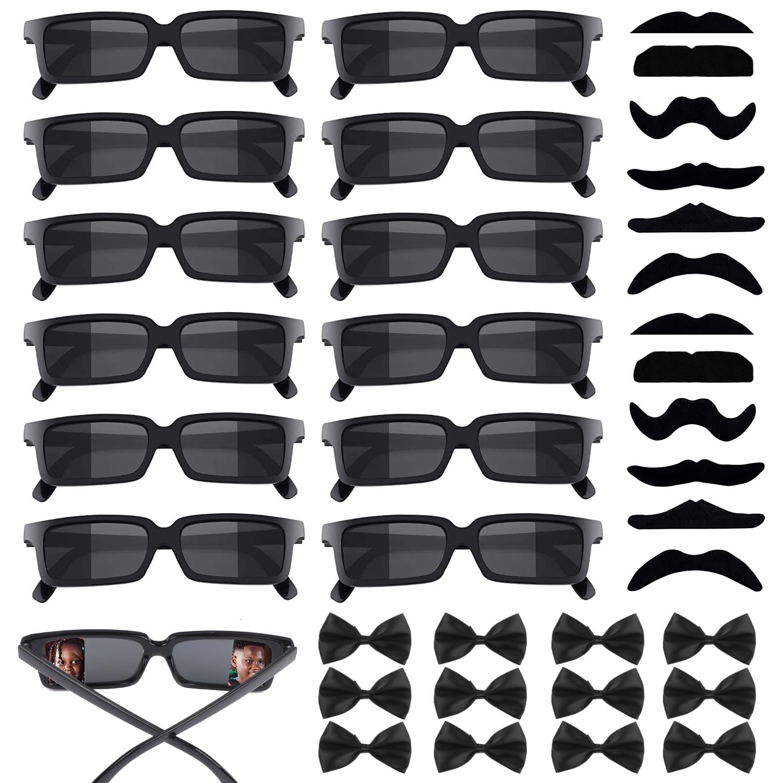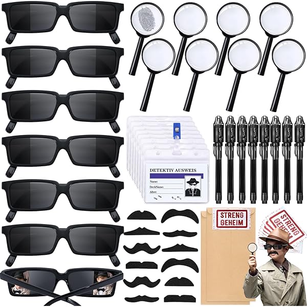 Abenteuer vorprogrammiert mit diesem coolen Detektiv-Set! Enthalten sind 10 Agentenbrillen mit speziellem Rückansichts-Design und 48 selbstklebende künstliche Schnurrbärte. Das Geniale an den Brillen: Die verspiegelten Außenkanten lassen dich nach hinten schauen, ohne den Kopf zu drehen - genau wie ein echter Geheimagent! Die Brillen sind aus hochwertigem PC-Material, die Linsen aus AC-Material, mit abgerundeten Ecken und super leicht. Mit 14 cm Breite und 13,5 cm Bügellänge passen sie sowohl Kindern als auch Erwachsenen. Die künstlichen Bärte haften stark und lassen sich leicht wieder entfernen. Perfekt für Geburtstagspartys mit Detektiv-Motto, Karneval oder einfach nur zum Verkleiden und Spielen. Das Set reicht für eine ganze Kindergruppe und sorgt für stundenlangen Spielspaß. Die Brillen sind robust genug für wildes Agenten-Getümmel, aber trotzdem leicht und bequem zu tragen. Einfach aufsetzen, Bart ankleben und schon kann die Geheimmission beginnen!
