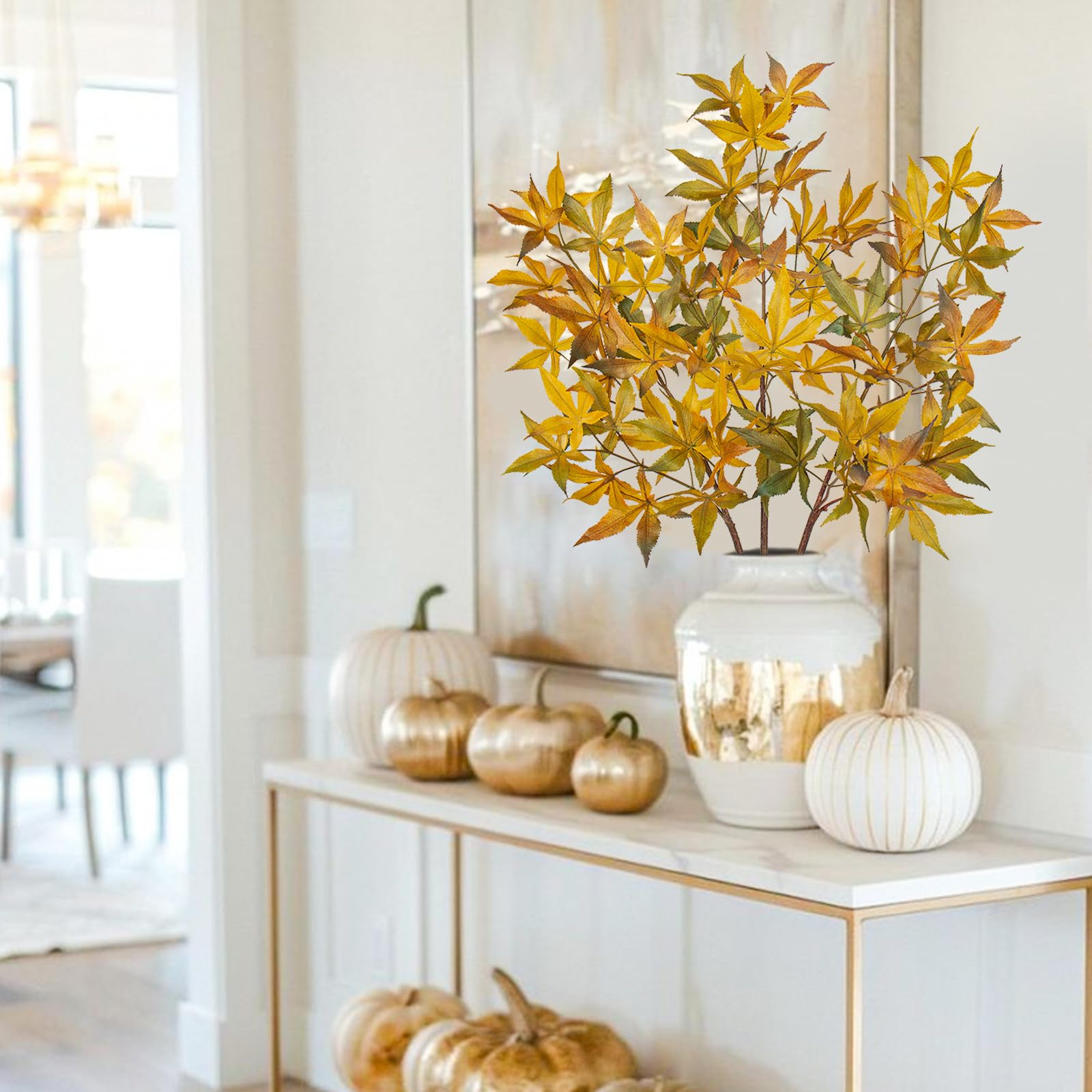 Bring den goldenen Herbst in dein Zuhause - ganz ohne welkende Blätter! Dieses 3er-Set mit künstlichen Ahornzweigen sieht täuschend echt aus und bleibt immer farbenfroh. Jeder Zweig ist ca. 68cm hoch und zeigt sich in wunderschönen Herbstfarben: Rot, Orange und Gelb. Die Blätter sind aus hochwertigem Stoff mit fein ausgearbeiteten Adern, die Stiele aus robustem Kunststoff. Super pflegeleicht - einfach mal mit einem feuchten Tuch abwischen und schon sind sie wieder staubfrei. Kein Gießen, kein Schnippeln, keine Allergien! Perfekt für deine Herbst-Deko: Ob als Tischdekoration für Thanksgiving, als Halloween-Schmuck oder einfach um dein Wohnzimmer gemütlich herbstlich zu gestalten. Die Zweige lassen sich leicht biegen und formen - so kannst du sie perfekt an deine Vase oder dein Dekorationskonzept anpassen. Auch super für Geschäftsdekorationen, Restaurants oder Hotels. Einfach unkaputtbar und jedes Jahr wieder verwendbar - das ist nachhaltige Deko die richtig was hermacht!