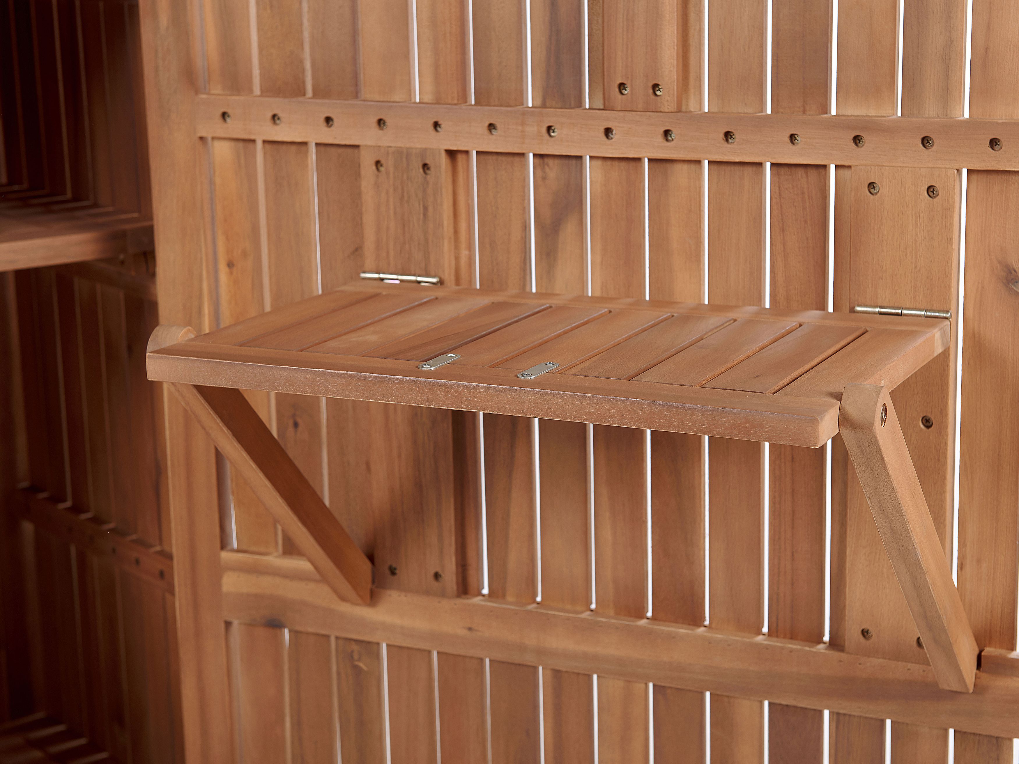 Ordnung im Garten! Dieser massive Schrank aus Akazienholz bietet jede Menge Stauraum für deine Gartengeräte. Mit wetterfestem Stahldach - schützt vor Regen und Sonne. Drei feste Regale und Aufhängemöglichkeiten - alles hat seinen Platz. Die klappbare Türinnenseite gibt extra Ablagefläche. Einfach selbst aufzubauen (45-60 Minuten). Braun lackiert - passt zu jedem Gartenstil. Maximal 10 kg Belastung pro Fach. Deine Gartensachen sind immer griffbereit und geschützt. Endlich kein Chaos mehr in der Gartenhütte!