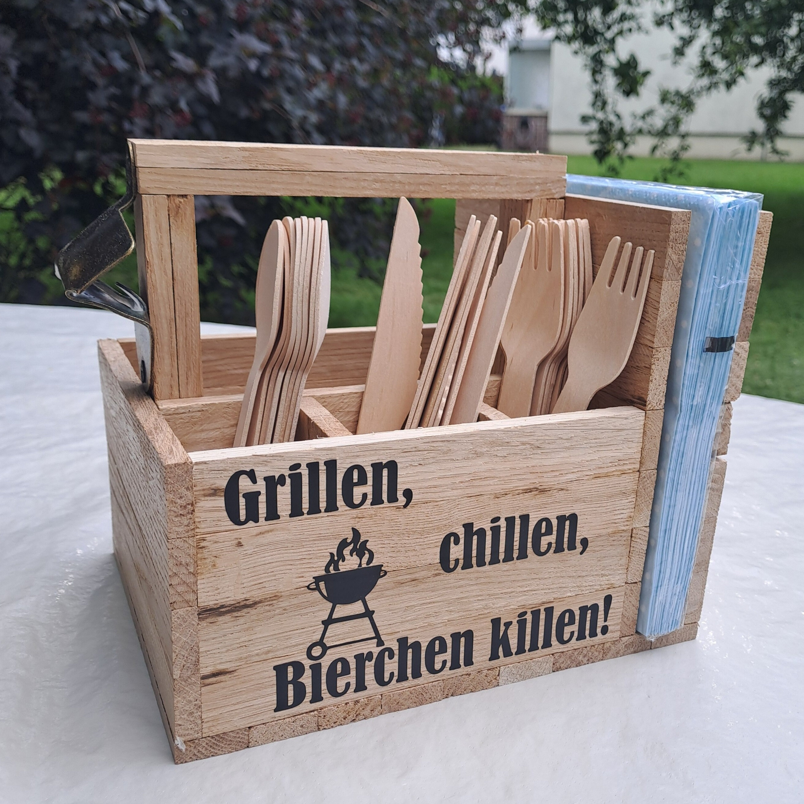 Das perfekte Geschenk für jeden Grillmeister! Diese handgefertigte Aufbewahrungsbox aus massivem Akazienholz ist nicht nur super praktisch, sondern sieht auch noch toll aus. Mit 5 Fächern für Besteck, Saucen, Gewürze und Servietten - selbst kleine Bierflaschen (0,33l) finden Platz. Der integrierte Flaschenöffner am Griff ist genial praktisch. Mit dem lustigen Spruch 'Grillen, Chillen, Bierchen Killen!' sorgt sie für gute Stimmung auf jeder Grillparty. Aus unbehandeltem Holz - nachhaltig und langlebig. Ob zum Vatertag, Geburtstag oder einfach so - dieses Geschenk kommt garantiert gut an!