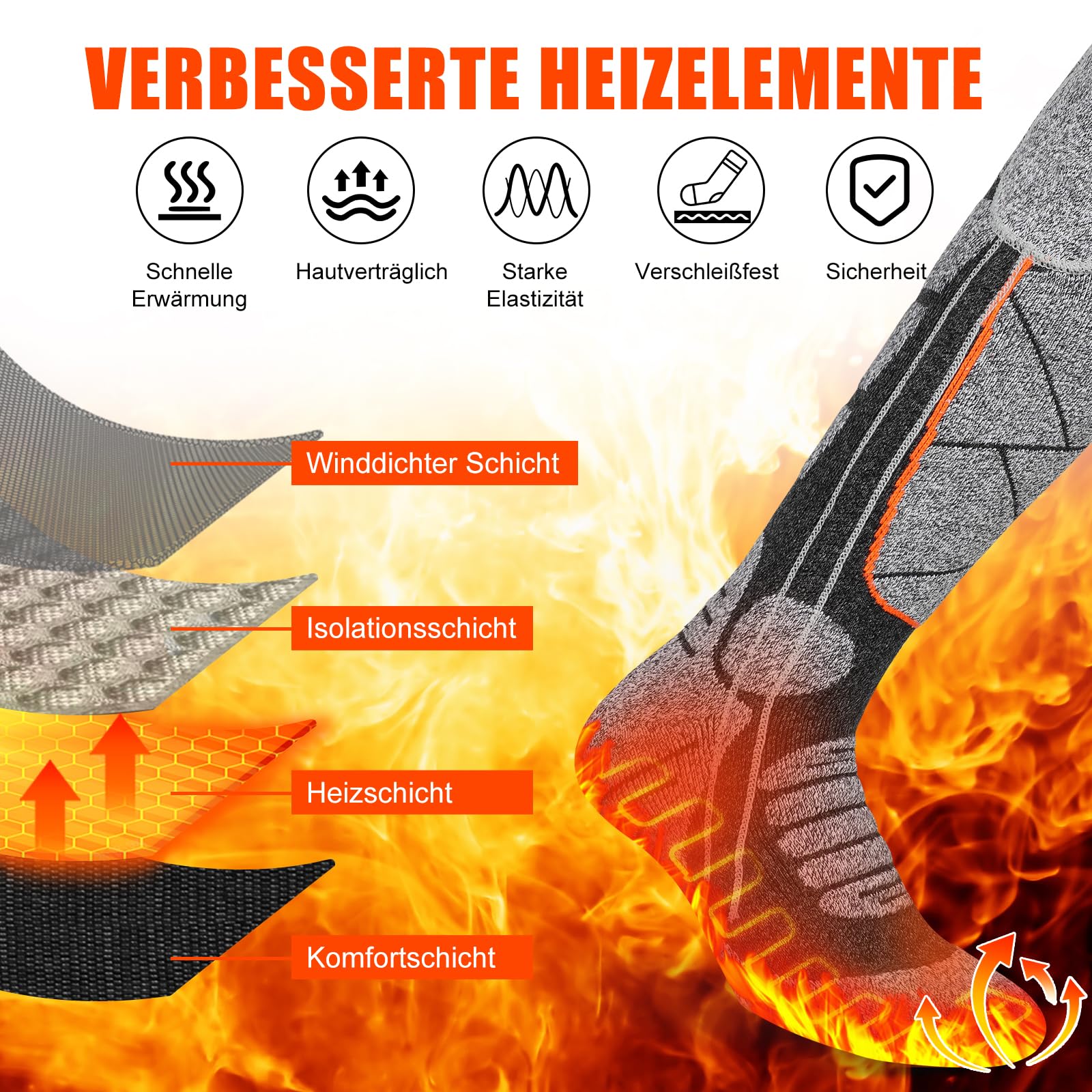 Nie wieder kalte Füße! Diese genialen Socken heizen sich selbst auf - bis zu 65°C! Perfekt für kalte Wintertage, ob beim Skifahren, Wandern oder einfach nur zu Hause. Der integrierte Akku hält bis zu 9 Stunden, je nachdem welche Stufe du wählst. Drei Temperatur-Levels stehen zur Auswahl - von gemütlich warm bis richtig kuschelig. Die Heizdrähte sind super fein und verteilen die Wärme gleichmäßig. Jetzt neu mit extra Heizzone an den Zehen! Einfach über den Knopf am Schaft bedienen - kein separates Gerät nötig. Aus weicher Baumwoll-Mischung - angenehm zu tragen und atmungsaktiv. Ideal für Outdoor-Sport oder Arbeiten im Freien. Auch ein super Geschenk für Menschen, die schnell frieren. Einfach aufladen und losheizen - deine Füße werden's dir danken!