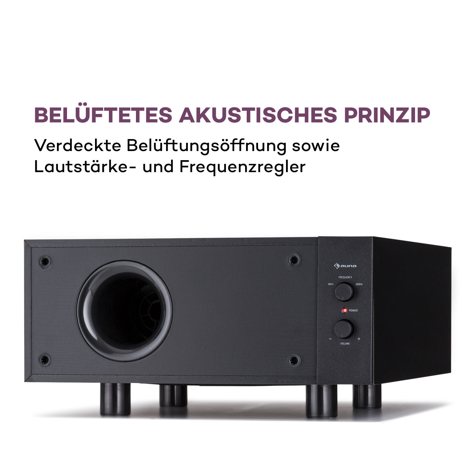 Spürst du den Bass! Der Audizio SW65C Aktiv-Subwoofer bringt echtes Kino-Feeling in dein Wohnzimmer. Mit 130W Leistung und einem 6,5 Zoll Tieftöner liefert er satte, tiefe Bässe für Filme, Musik und Gaming. Das Bassreflexrohr verstärkt den Sound zusätzlich. Perfekt anpassbar: Regelbare Frequenzweiche bis 250Hz, Lautstärkeregler und Phasenumschaltung (0°/180°) für optimale Integration in dein Soundsystem. Nach unten gerichteter Tieftöner für gleichmäßige Bassverteilung. Resonanzarmes Gehäuse verhindert störende Vibrationen. Anschlüsse: Cinch und AUX für TV, Verstärker und mehr. Robuste Gummifüße für stabilen Stand. Elegantes schwarzes Design passt in jedes Interior. Einfache Installation - sofort einsatzbereit. Hol dir den vollen Sound!