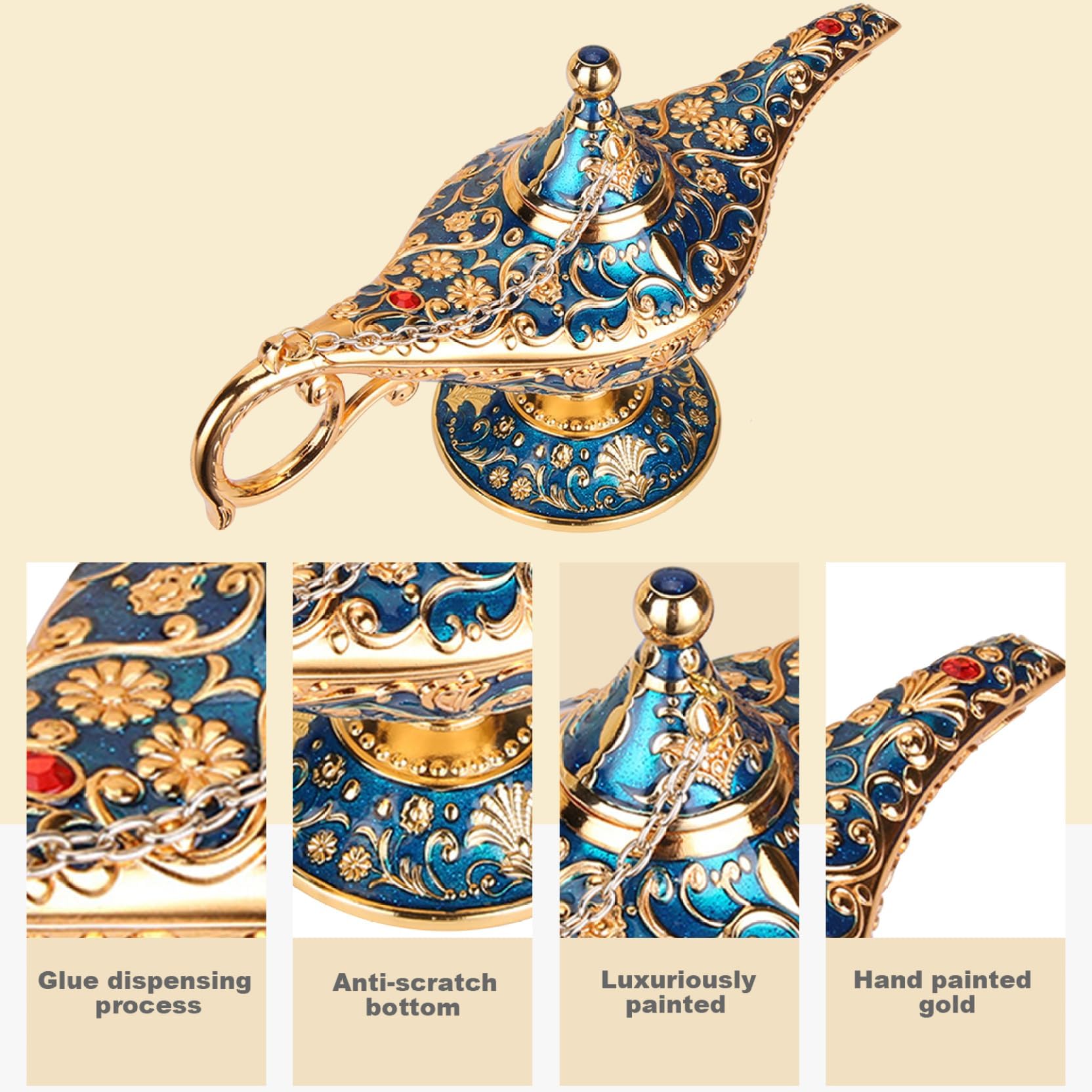 Triff den Geist aus der Lampe! Diese coole Aladdin-Lampe in Rot-Gold bringt orientalischen Flair in dein Zuhause. Aus Kunststoff gefertigt, aber mit wertig aussehender Oberfläche, ist sie perfekt als Deko-Stück. Mit 23x13cm ist sie genau die richtige Größe für den Couchtisch oder das Regal. Ideal für Halloween-Partys, Mottoschows oder einfach als hübsche Deko. Kann auch als Teekanne oder Zahnstocherbox verwendet werden - ganz wie du willst! Aber Achtung: Sie ist nur zur Dekoration, nicht für echte Kerzen geeignet. Hol dir ein Stück aus 1001 Nacht und lass deine Wünsche wahr werden - zumindest optisch!